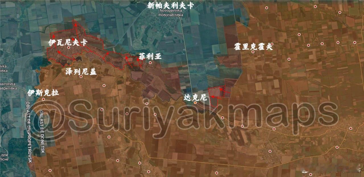 4、新帕夫利夫卡:俄军成功攻占菲利亚河和沃夫恰河以西森林地区附近的一系列阵地,并继续沿顿第聂伯罗彼得罗夫斯克州界推进。此外,俄军完全控制了伊万尼夫卡地区及其以北山区。