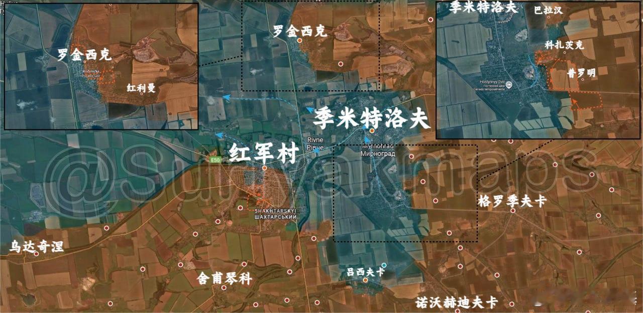 3、红军村:乌克兰军队开始撤离季米特洛夫,同时在南部保持防御。但俄军已在斯捷普纳街和皮什恰尼街建立据点,并试图向乌克兰军队主要抵抗点,包括5/6号矿区的防御阵地推进。红军村的乌克兰军队也开始撤退,但规模较小。目前乌克兰几乎失去了该市一半地区,而俄军则继续巩固铁路线以南被废弃的阵地(红军村40%以上的地区目前处于俄军控制之下)。此外俄军在罗金西克继续推进,已经占领了东部的大部分高层建筑,还从北部抵达了35号学校。