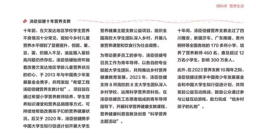 不仅社会在行动,企业也一直在行动。汤臣倍健作为膳食营养补充剂行业的领先品牌,公司先后携手中国青少年发展基金会、中国大学生知行促进计划等组织于2013年共同发起“汤臣倍健营养支教计划”,以切实行动助力乡村孩子营养改善。
