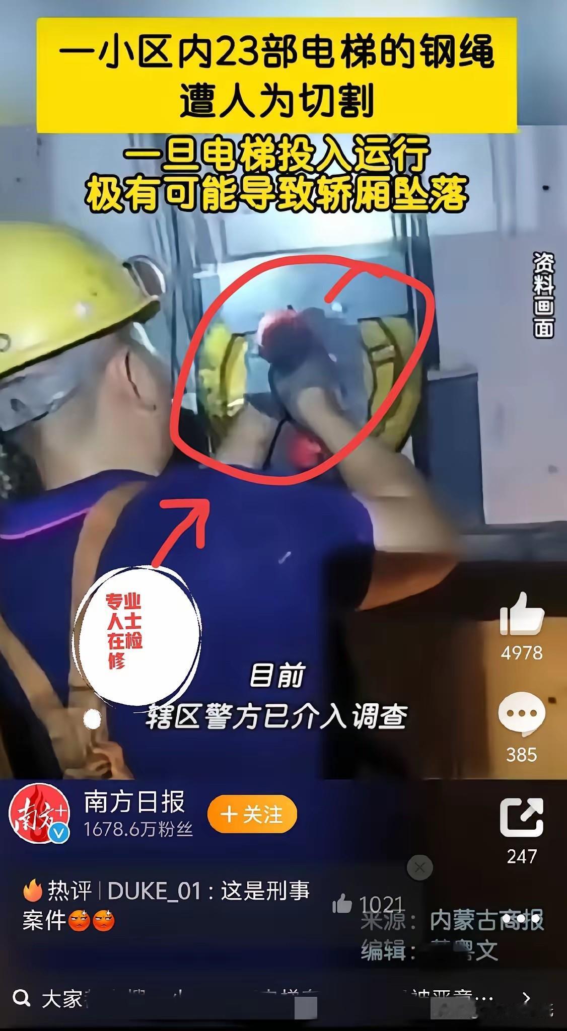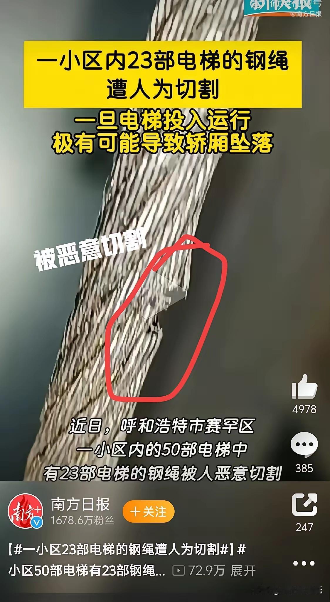 50部电梯竟有23部的承重钢绳被人为破坏。有人认为,涉事男女的行为构成故意毁坏财物罪;也有人指出,依据治安管理处罚法,此类行为属情节较重,可处十日以上十五日以下拘留,并处一千元以下罚款。 但在一名退休老法官看来,故意剪断电梯缆绳绝非简单的财物损毁,而是一种蓄意报复破坏泄愤行为,其动机已超出毁坏财产的范畴,实质上是将不特定多数人的生命置于极度危险之中,严重威胁公共安全。 此类行为理应被认定为危害公共安全罪,必须依法从严、从重、从快予以惩处,以彰显法律威慑力,维护社会公共安全底线。