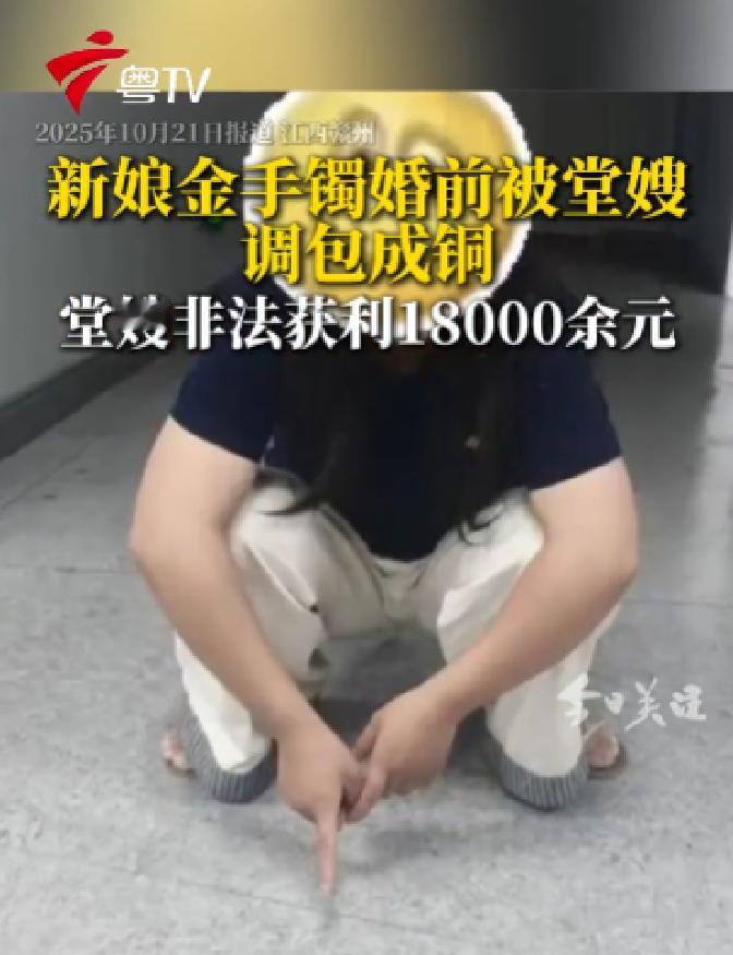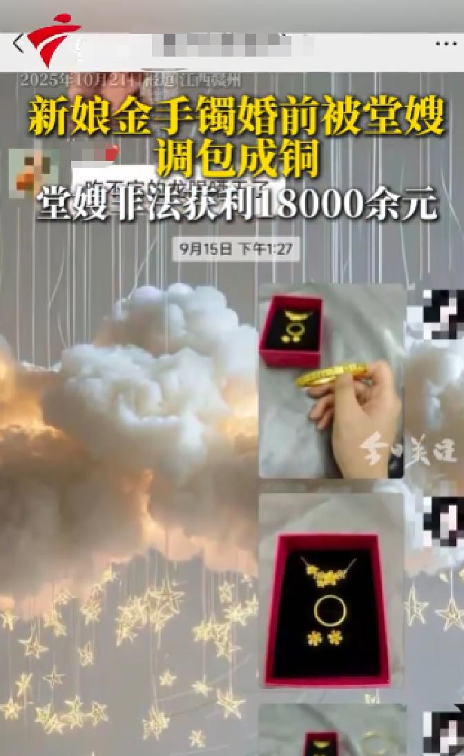 “防不胜防!”2025年10月,江西赣州,一女子结婚当天感觉手腕上的金手镯轻飘飘的,没想到,婚前她的金手镯就已经被堂嫂掉包成铜,堂嫂将真正的金手镯拿去卖了18000余元,网友:日防夜防,家贼难防! 这事的主人公叫小陈。 她为了自己的婚礼, 特地去金店挑了一套“五金”。 其中一个金手镯,款式新颖, 花纹也特别精致,小陈喜欢得不行。 买回来后,她高兴地拍了照片, 发到了自家的亲戚群里炫耀一番。 当时群里都是一片祝福和夸赞。 她堂嫂还特地私聊她, 说这个手镯真好很有眼光。 小陈心里美滋滋的,没多想。 婚礼前几天,堂嫂来她家串门。 说是来帮忙看看有啥需要准备的。 聊着聊着,堂嫂就提到了那个手镯。 “妹子,你那个手镯能给我看看吗?” “照片上看着就特别亮眼。” 小陈没多想,都是自家人, 就从卧室的抽屉里拿了出来。 堂嫂接过去,拿在手里反复看。 “真漂亮,我戴上试试行不?” 小陈笑着说:“嫂子你戴,好看你也去买个。” 堂嫂试戴了一下,嘴上不停地夸。 也就几分钟的工夫, 堂嫂就把手镯还给了小陈。 小陈顺手就放回了首饰盒里, 压根没起疑心,继续准备婚礼的事。 转眼就到了结婚这天。 早上化妆师和亲戚们忙作一团。 等穿戴首饰的时候, 小陈拿起手镯戴上。 就在手镯扣上的那一瞬间, 她心里“咯噔”一下。 感觉不对劲,这手镯怎么这么轻? 好像没有刚买回来时那种沉甸甸的质感。 她小声跟旁边的妈妈嘀咕了一句。 妈妈正在忙着招呼客人, 随口说:“今天你太紧张了,产生错觉了吧。” “快准备好,吉时要到了。” 婚礼现场人来人往,热闹非凡。 小陈也就暂时把这事抛在了脑后。 可一整天下来, 手腕上那种“轻飘飘”的感觉一直都在。 等到晚上送走所有宾客, 小陈累得不行,和丈夫回到婚房。 她第一件事就是把手镯摘下来。 放在手心掂了掂,越想越不对。 她跟丈夫说了自己的怀疑。 丈夫也拿过去看了 说:“看着一模一样是不是你想多了?” “别自己吓自己。” 小陈还是不放心。 她翻出当初买金饰时的照片和票据。 对着照片仔细一比, 好像颜色是有点点差别,没那么亮。 “不行,我明天必须去店里验一下!” 小陈下定了决心。 第二天一早,她就拉着丈夫去了金店。 老师傅接过去,用火一烧,再一掂量。 “姑娘,你这个不是金的。” “这是个铜镯子,外面镀了层东西。” 老师傅的话像晴天霹雳。 小陈当场就懵了,眼泪差点掉下来。 金店的发票是真的,东西是在这买的。 那就只剩一种可能了:被掉包了! 小陈和丈夫立刻报了警。 这可不是小事,价值一万多呢。 警察来了之后,开始仔细询问。 “这个手镯除了你,还有谁碰过?” 小陈仔细回忆,猛地想起了什么。 “我堂嫂!她前几天来我家试戴过!” 警察立刻将调查方向转向了她堂嫂。 一开始,堂嫂还矢口否认。 “天大的冤枉啊!我们是亲戚,” “我怎么可能干这种偷鸡摸狗的事?” 但警察早就查了监控。 发现她前阵子在网上买过一个铜手镯。 款式和图片,跟小陈的一模一样。 还在一家二手回收店附近出现过。 在证据面前,堂嫂的心理防线彻底崩溃了。 她哭着承认了一切。 原来她最近手头紧,欠了点钱。 看到小陈的金手镯就动了歪心思。 她先在网上花几十块买了个高仿的铜手镯。 然后借着串门的机会, 趁小陈不注意,来了个“偷天换日”。 得手后马上就把真金手镯卖了。 卖了一万八千多块钱, 很快就被她拿去还债和消费了。 她以为婚礼当天人多手杂, 根本不会有人发现这个秘密。 这件事让整个家族都炸开了锅。 谁也想不到,贼竟然出在自己家里。 小陈一家是又气又心寒。 为了钱,亲情在有些人眼里真是一文不值。 金钱确实是人性的试金石,能照出一些人内心深处的贪婪和自私,让人防不胜防