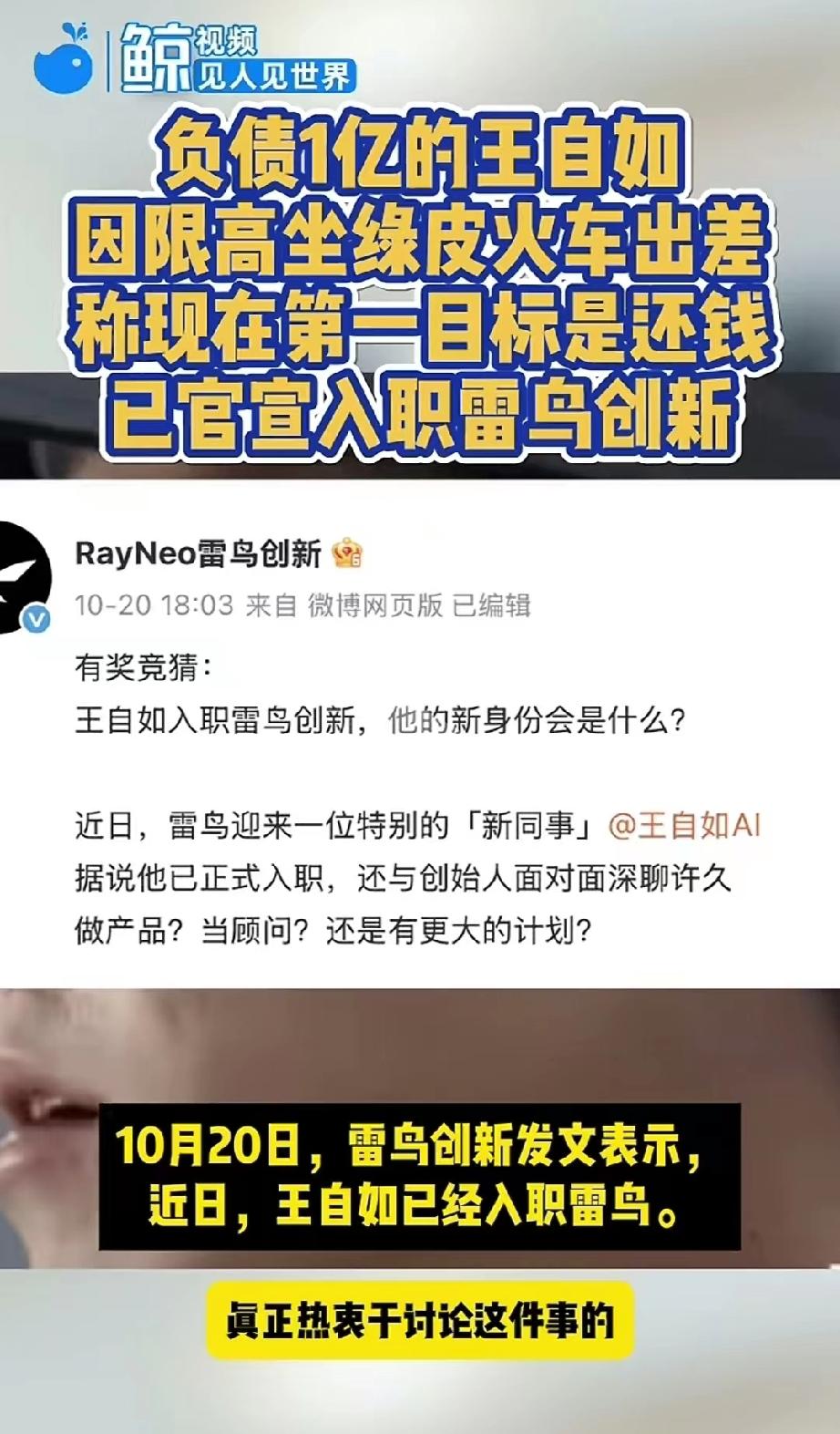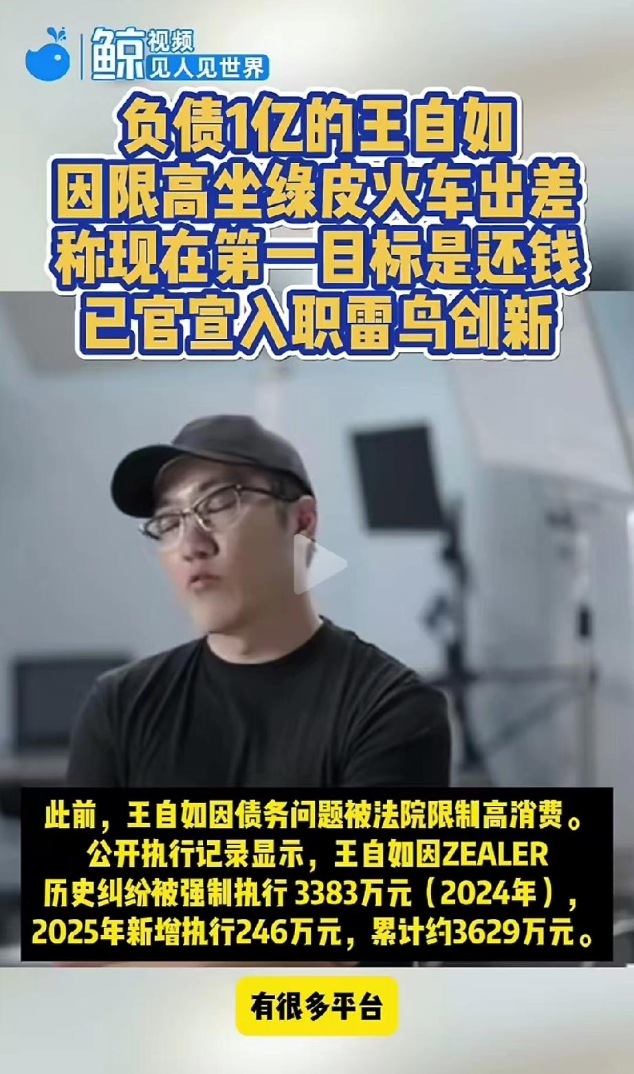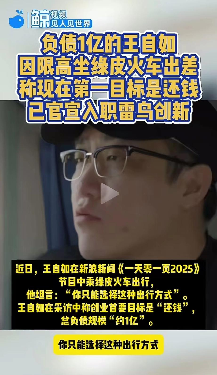上一次刷到王自如的消息,还是关于他入职格力,居高临下,对着下属训话,要求下属要努力。 没想到,再一次刷到王自如的消息,便是,王自如负债1亿因限高坐绿皮火车出差。称现在第一目标是还钱,目前已经官宣入职雷鸟创新。 真的不知道他这一个亿是怎么欠的。 按道理说他以前搞的是电子产品的测试,也算是最早的自媒体,自媒体一般都是轻资产,怎么欠了这么多。 对此大家怎么看,不妨在评论区留下您的看法。