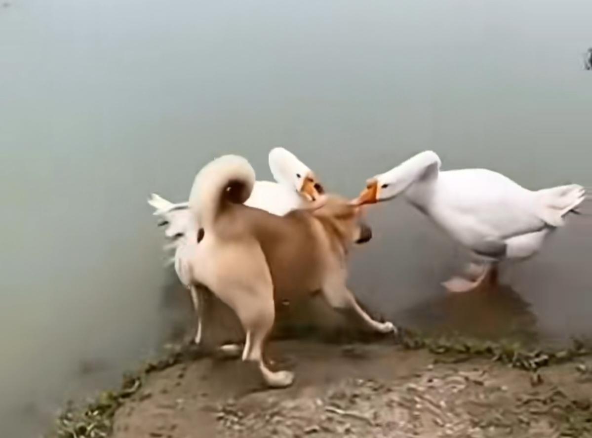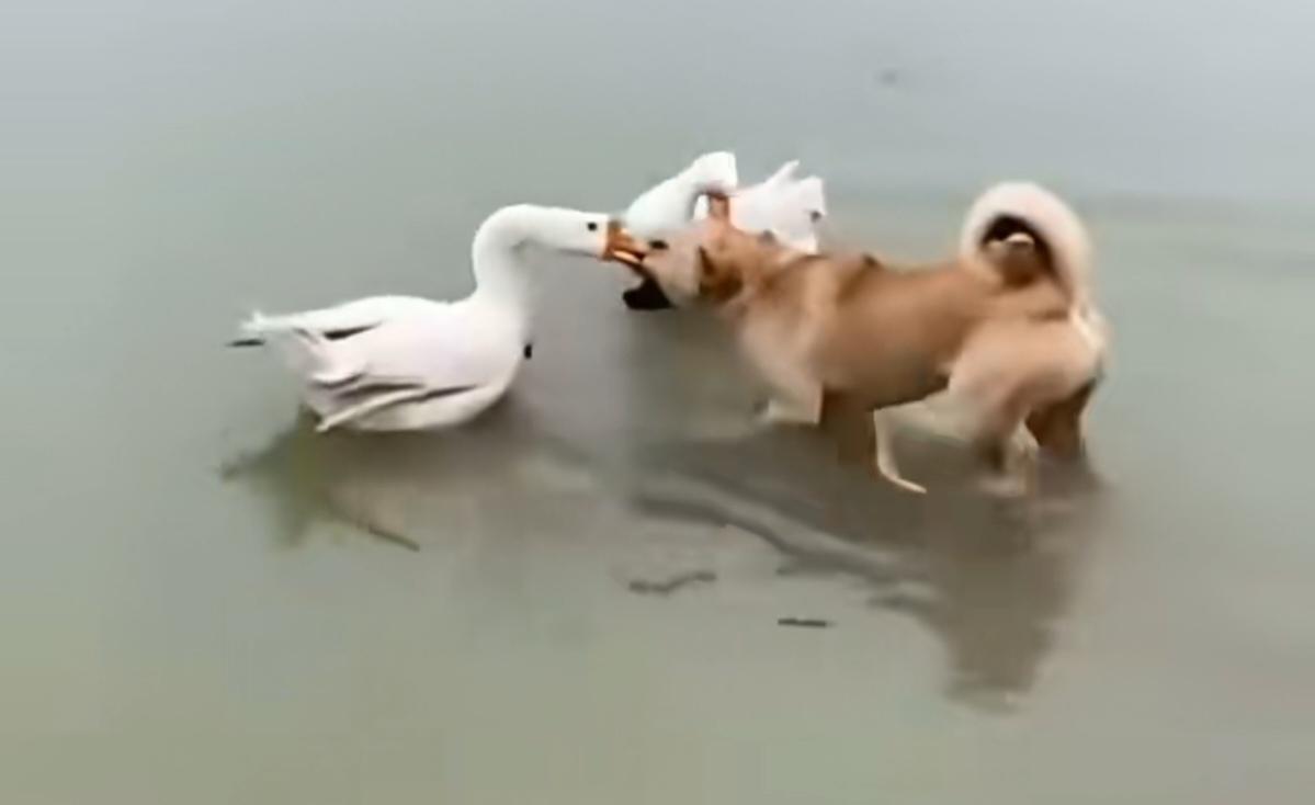 鹅比我们想象中要厉害一些,还懂得团结力量大,还知道左右开弓,还斗得赢不大不小的狗子!一条体型比鹅大的黄色狗子不知怎么的惹到了大鹅,被两只大鹅左右开弓,一只咬住狗子左上嘴唇,一只咬住狗子右耳朵,狗子竟然毫无反抗之力被两大鹅合力拖入河水中…狗子真的是外强中干!(图片来自网络视频截图)