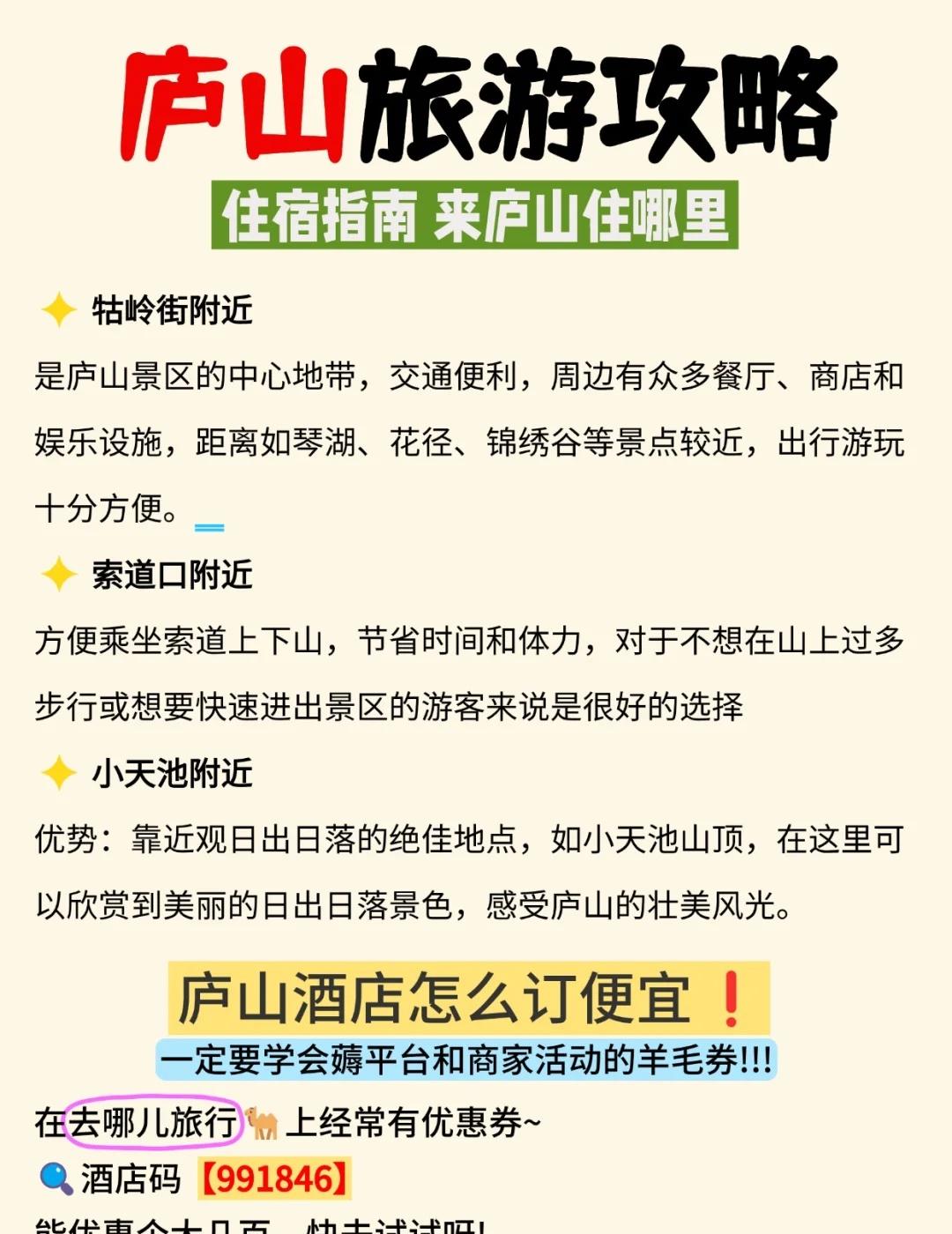 真心建议10-12月去庐山的姐妹👯♀听劝 秋冬如果想要来庐山徒步看秋景雪景的姐妹们👭,可以看看这份攻略噢!! 整理了一份很实用的庐山旅游攻略 包含爬山路线和庐山住宿攻略,希望可以帮到大家💖 - 🏨住宿推荐 📍牯岭街附近 📍索道口附近 📍小天池附近 - 🏃庐山徒步爬山路线 ✅纵向路线:西线+中线+东线,住宿牯岭镇 ▶️D1:南门—(观光车)—如琴湖—石门涧—(星龙索道/观光车)—电站大坝—芦林湖—小天池—牯岭镇 ▶️D2:牯岭镇—(观光车)—含鄱口—五老峰—三叠泉—东门 ❗️注:以上都是观光车站点,根据体力选择步行或者坐车。也可选择从西门索道上山 ✅环形路线:山顶+环山,住宿山下 ▶️D1:南门—(观光车)—如琴湖—各山顶景点—(观光车)—南门 ▶️D2:南门—东林大佛—白鹿洞书院—三叠泉 ❗️注:D2景点较为分散,距离较远,可选择打车。 ✅暴走路线:好汉坡+中线+东线 ▶️好汉坡—牯岭镇—芦林湖—五老峰—三叠泉—东门 ❗️注:特种兵一日路线,徒步时间约10小时,对体力要求高。 ⭕️关于自驾:非旺季时可从南门、北门自驾上山,停车票45元。部分景点私家车不能进入。 - 庐山攻略 庐山徒步 庐山酒店 九江庐山 庐山雪景 庐山旅游攻略 庐山拍照 庐山爬山攻略 庐山瀑布