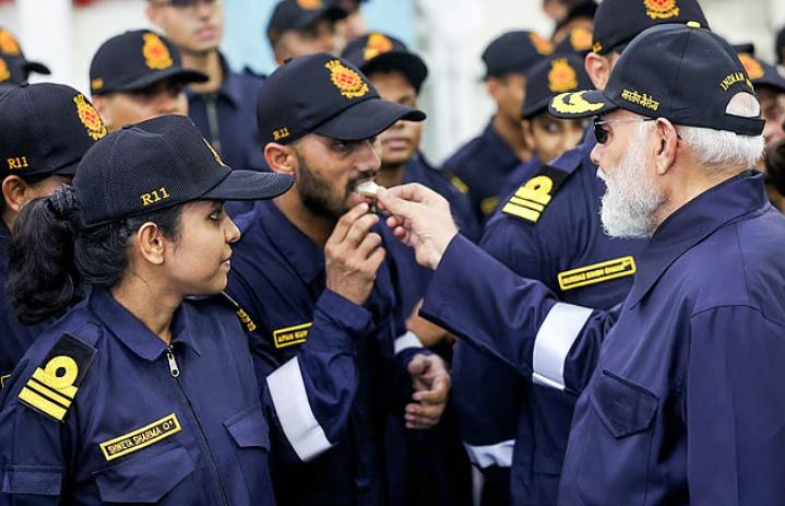 印度总理纳伦德拉·莫迪,身穿印度海军夹克,头戴海军帽,登临印度航母“维克兰特”号,与舰上官兵一起度过本年度的排灯节,官方发布的照片背景是数架米格-29战斗机,气场强大。 在观看了舰载米格-29K战斗机和海军直升机的演示飞行后,莫迪借机赞扬了本国海军的力量,并回顾了它在“辛门行动”中所起的作用,而那次行动让整个巴基斯坦都感到恐惧。 莫迪总理还表示,该舰的威力足以在战斗尚未开始时就击溃敌人的士气。他同时强调,维克兰特号不仅是一艘军舰,更是印度不懈奋斗的见证。