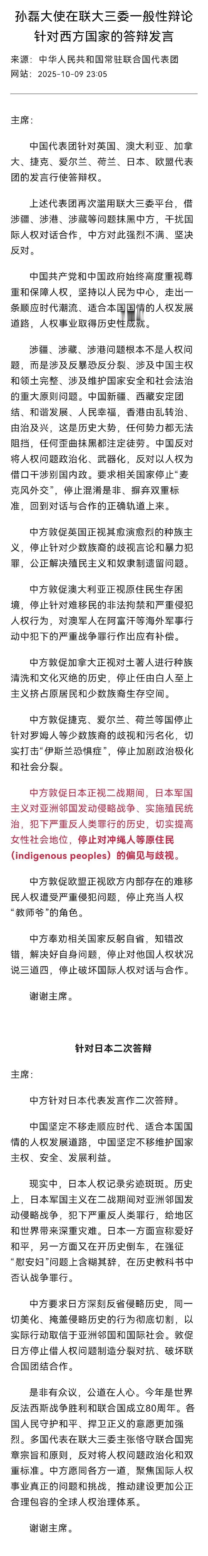 好,中国常驻联合国代表正式承认冲绳人民为“原住民”! 一句话,冲绳是被日本军国