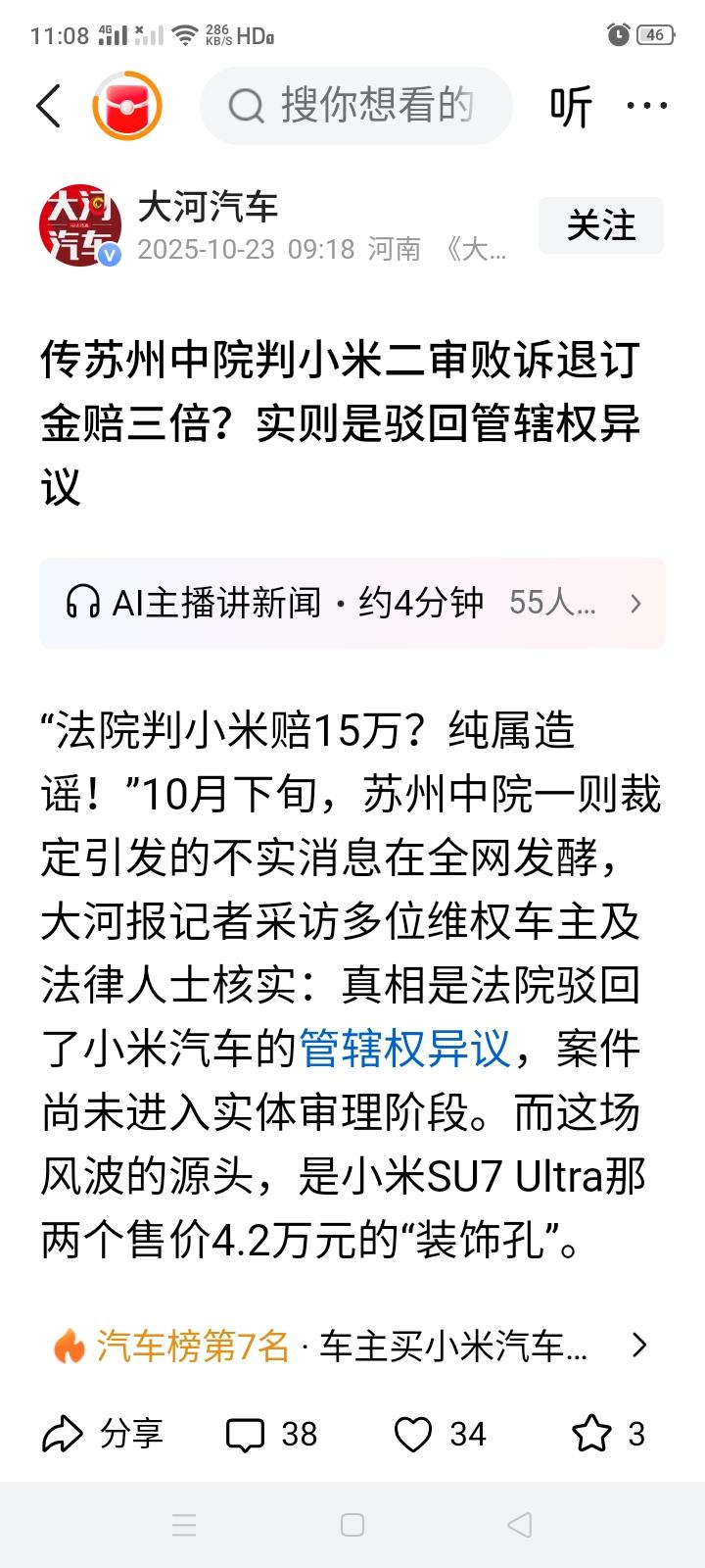 一审胜诉,小米汽车不服上诉,二审苏州中院驳回上诉、维持原判? 小米车主因购车预付款及小米 ultra 4.2 万元“装饰孔”涉嫌欺诈起诉小米汽车一案,已折腾半年有余。一审、二审均判定小米车主胜诉,本以为此案就此了结,谁料闹了大半年,原来只是驳回了小米提出的管辖权争议。小米汽车为何会对车主的起诉地点存在争议呢?不都在中国境内吗?难道中国各省适用的法律有所不同?从 2 月份至今已过去 9 个多月,小米仍在为开庭地点争论不休,中国的司法资源就这样被白白浪费了!