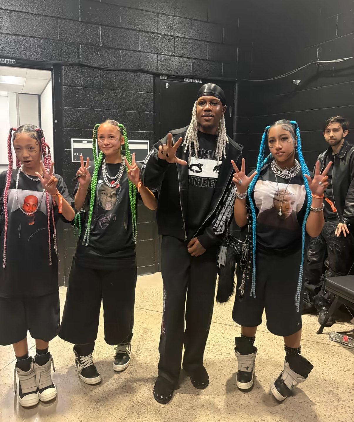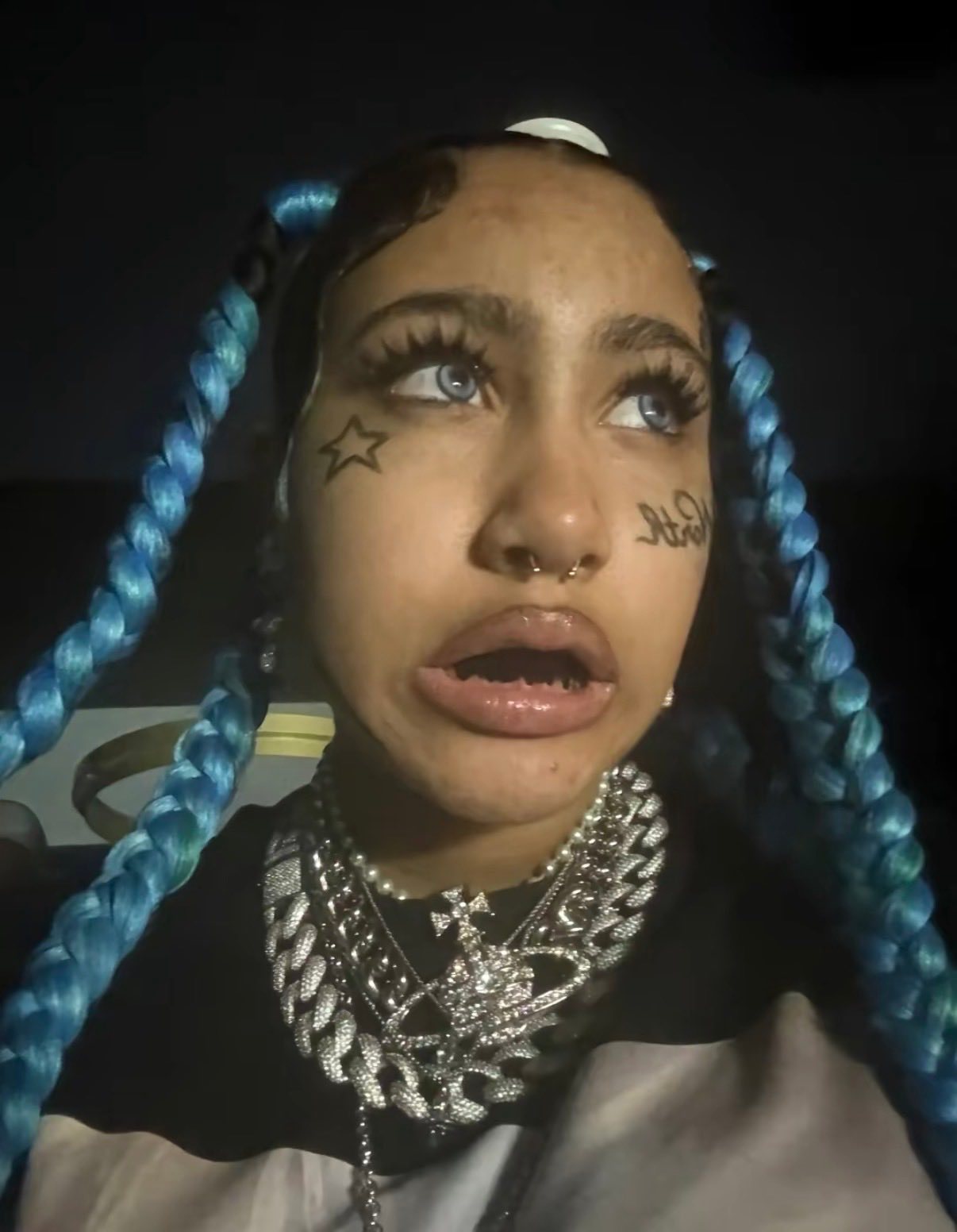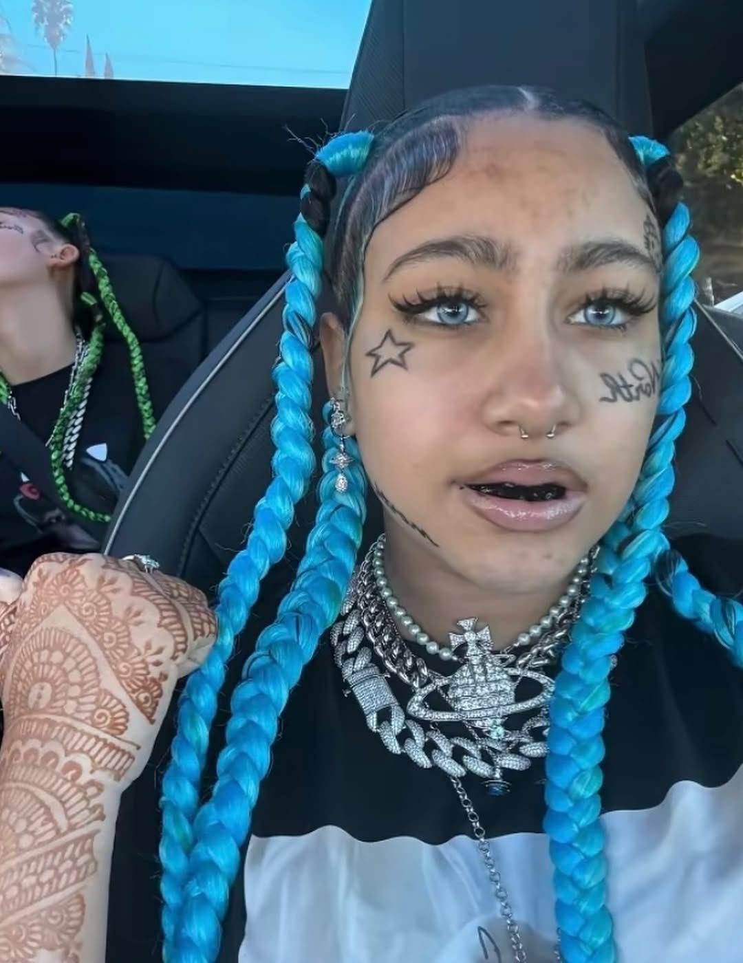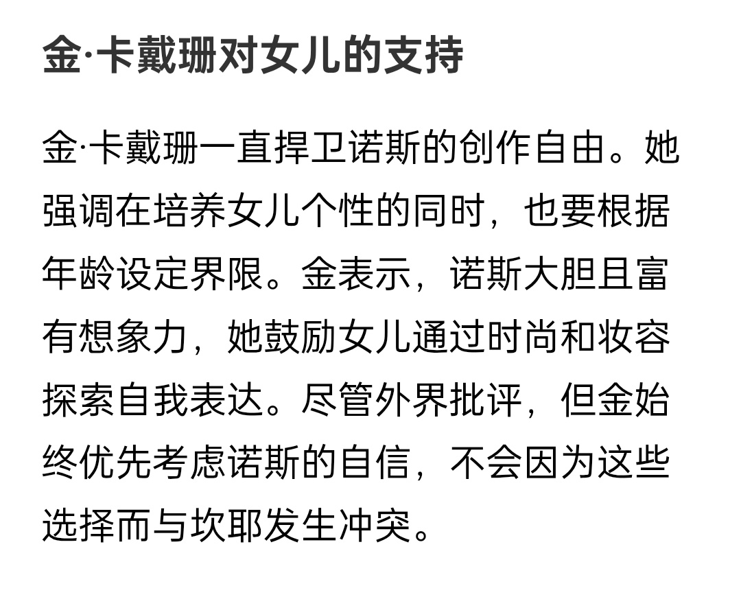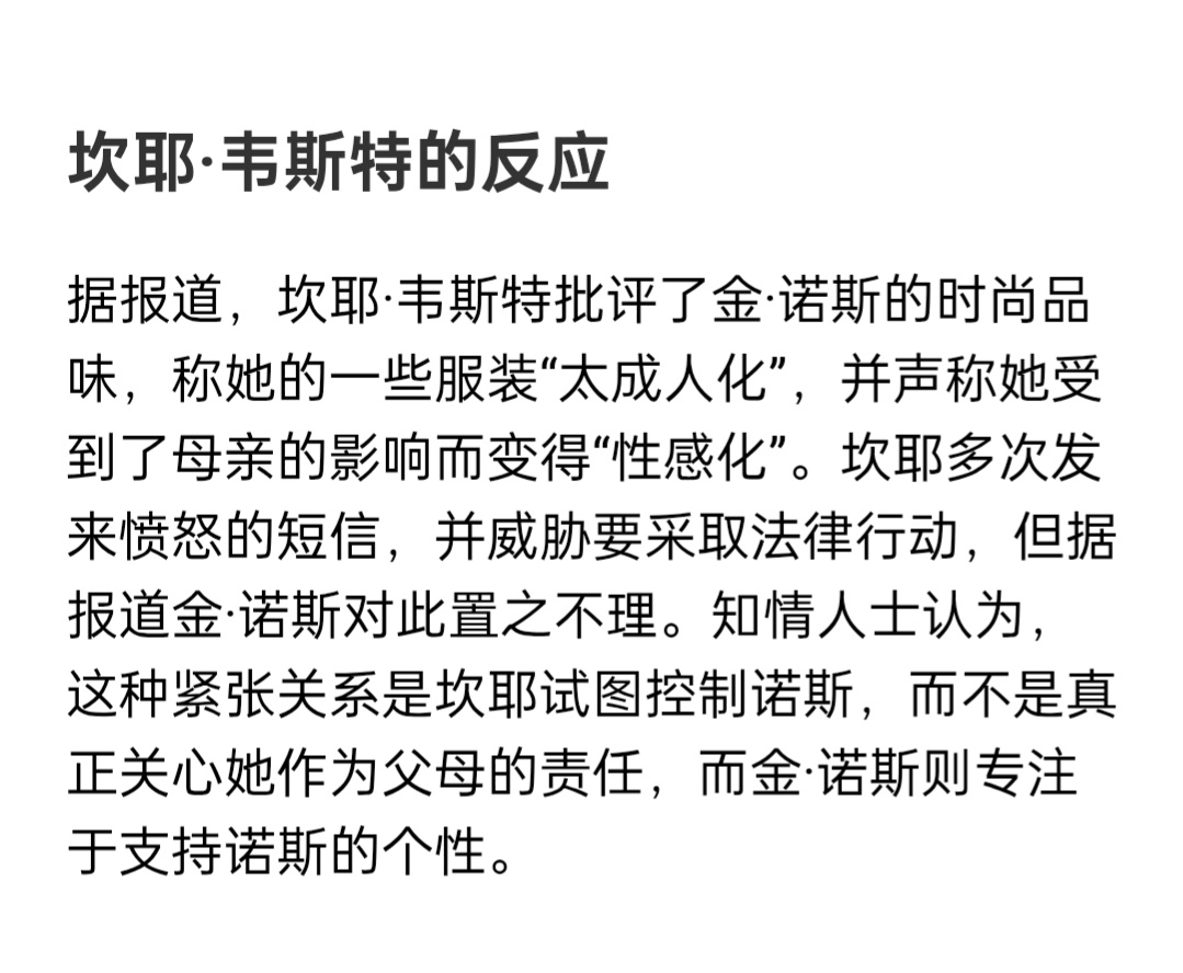卡戴珊和坎耶12岁女儿诺丝(小西北)的新造型再次引发热议(图1234),蓝色发辫、面部纹身(假的)、鼻环、黑色牙套、蓝色美瞳。。卡戴珊表示不会扼杀女儿的想象力,鼓励诺丝通过时尚和妆容探索自我表达。侃爷据说很生气,上次诺丝过于成年化的造型已经让他震怒(图789),私下发了很多短信给卡戴珊表示抗议。