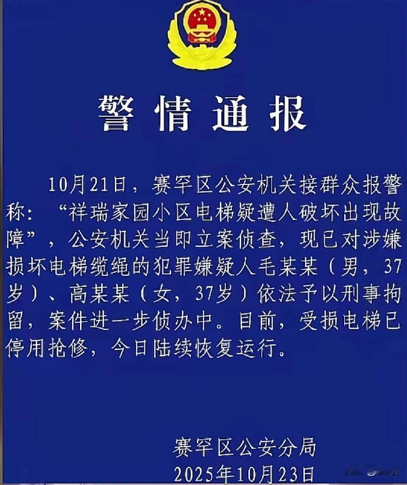 小区电梯是方便业主上下楼的工具,每天都要承载很多人的重量,为了保障大家出行安全,各小区都配备检修人员经常检查。然而有些人竟然不顾他人人身安全,故意毁坏电梯承重钢绳,这种事最近发生在呼和浩特,而网友知道后,觉得这种行为太恶劣了,必须要严判,只有这样,才能引起那些心思险恶人的重视,也才能保障业主人身安全。 据媒体报道,近日内蒙古呼和浩特市赛罕区呼伦贝尔南路一个小区发生一起严重的电梯人为破坏事件。 原因大概是电梯检修人员在日常巡检中发现钢绳被切割,存在安全隐患,于是报警。 据统计,这个小区一共有50部电梯,然而竟然有23部电梯的关键承重钢绳被切割。 从上传图片看,虽然没有完全断掉,但隐藏着巨大的安全隐患,时间长了,经过磨损这些钢绳就会很快断掉,将会有多人生命受到威胁。有的切割程度比较严重,程度达到钢绳直径的1/3,危险程度不敢想象。 看着图片都让人触目惊心,我们都知道,现在楼层建筑都挺高的,人们出行都是乘坐电梯,如果电梯发生故障坠入电梯井,那多数会造成家庭悲剧。 好在当地警方立刻介入调查处理,目前有37岁的男性毛某某和37岁的女性高某某被刑拘,事情还在侦办当中。 不过要对23部电梯的承重钢绳下手,不光需要专业知识,还需要作案工具,当然时间还需要足够。 两人的作案动机是什么,等待解答。 这里多亏了检修人员及时发现,否则不知什么时候就会发生险情。 有网友看了这事后就说这两人作案,能打开电梯,肯定与物业或相关人员有关,也有网友说从楼顶就能进入到电梯轿厢,这事只有他俩人清楚。 不过多数网友称这事必须重判,两人行为跟故意杀人没有区别,判死刑都没有反对,是啊,情节太恶劣,影响太大了,或许这个小区的业主以后乘坐电梯,稍微有点异样反应都会非常紧张的吧。 更有网友觉得他们有技术没脑子,考虑事太简单,因为他们忽略了一件事,那就是电梯每月都要例行检查的。 目前,停用维修的电梯已陆续恢复运行,希望警方严肃处理这两人杜绝这种行为发生!