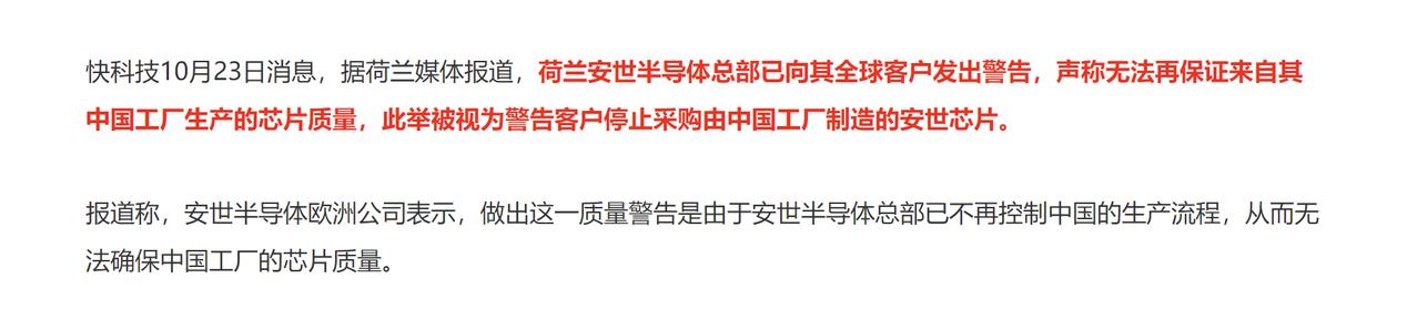 安世中国独立运营后,荷兰彻底急了发出警告:不准买中国工厂芯片!14亿人自己的市场,不是荷兰可以干涉的 在安世中国宣布独立运营以后,荷兰是彻底急了,要知道,安世生产的芯片产品近80%都是在安世中国的东莞工厂里。这也意味着荷兰安世不仅是一个空壳,还需要面对交不出货的违约赔偿。 为此,安世荷兰发出警告,不准买中国工厂芯片,理由是无法再保证来自其中国工厂生产的芯片质量。 实在是搞笑,之前以莫须有的“公司存在治理问题”为由,强行接管了安世半导体,并任命外籍人士接任。 中国直接展开反制,禁止安世中国生产芯片出口,然后荷兰安世不再支付劳动报酬,且公司系统权限也被全面中断。想要彻底拿捏住安世中国,甚至搞垮安世中国,这样中国也没有办法得利。 但是荷兰是彻底低估了中国了,有了中国作为靠山,安世中国直接宣布独立运营,这样荷兰是彻底傻眼了,安世中国拥有完整研发团队、成熟封测工厂和稳定客户网络的企业,只需要重新找一个晶圆厂代工,就可以独立运转下去。 而荷兰安世空有晶圆厂,想要在海外重新找一个可以年产能500亿枚的封测厂,可是非常困难的,特别是中国占据全球封测市场超三分之一份额的产业格局中,想要在短期内重建如此规模的封测体系无异于天方夜谭。这就意味着,荷兰安世已经成为了一个空壳。 所以荷兰才会彻底急眼,现在的局面,即使是最坏的结局,也是荷兰惨败,但是荷兰的警告没有任何意义,14亿人自己的市场,可不是荷兰可以干涉的。 而且荷兰自己还是想想吧,开了强抢他国企业的坏头,其他国家还敢在去荷兰投资吗,而且荷兰的ASML有40%的营收可是依赖于中国,ASML的核心原材料也要依赖中国提供。 如果真惹急了中国,荷兰到时候只怕得把ASML都搭进去。