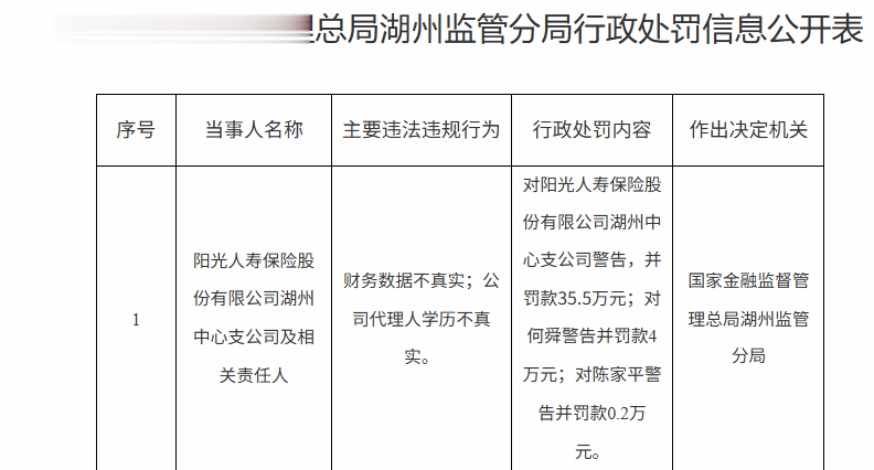 经查,阳光人寿湖州中心支公司及相关责任人存在财务数据不真实、公司代理人学历不真实的违法违规行为。根据相关监管规定,国家金融监督管理总局湖州监管分局作出如下处罚决定:对阳光人寿保险股份有限公司湖州中心支公司给予警告,并处以35.5万元罚款;对责任人何舜给予警告,并处以4万元罚款;对责任人陈家平给予警告,并处以0.2万元罚款。