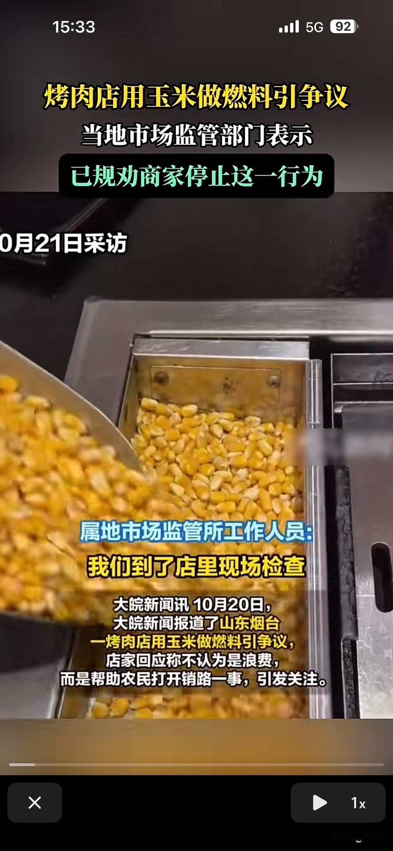 烤肉店用玉米作燃料引争议 当地市场监督管理员表示已经规劝商家停止这一切活动。并将视频进行下架。