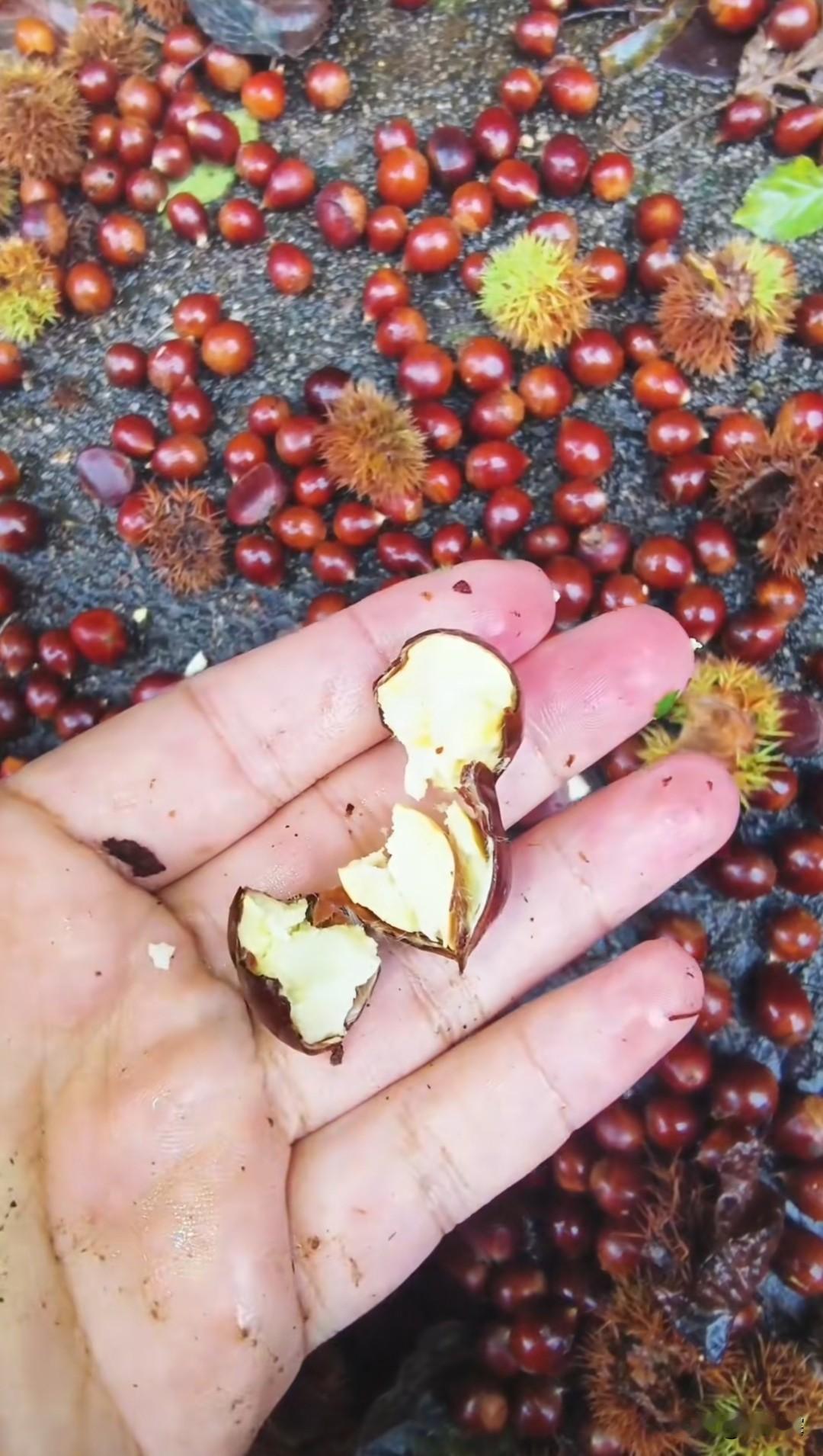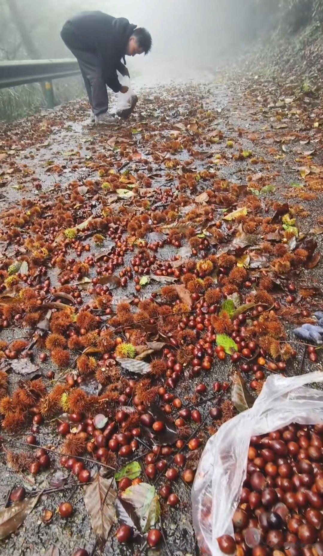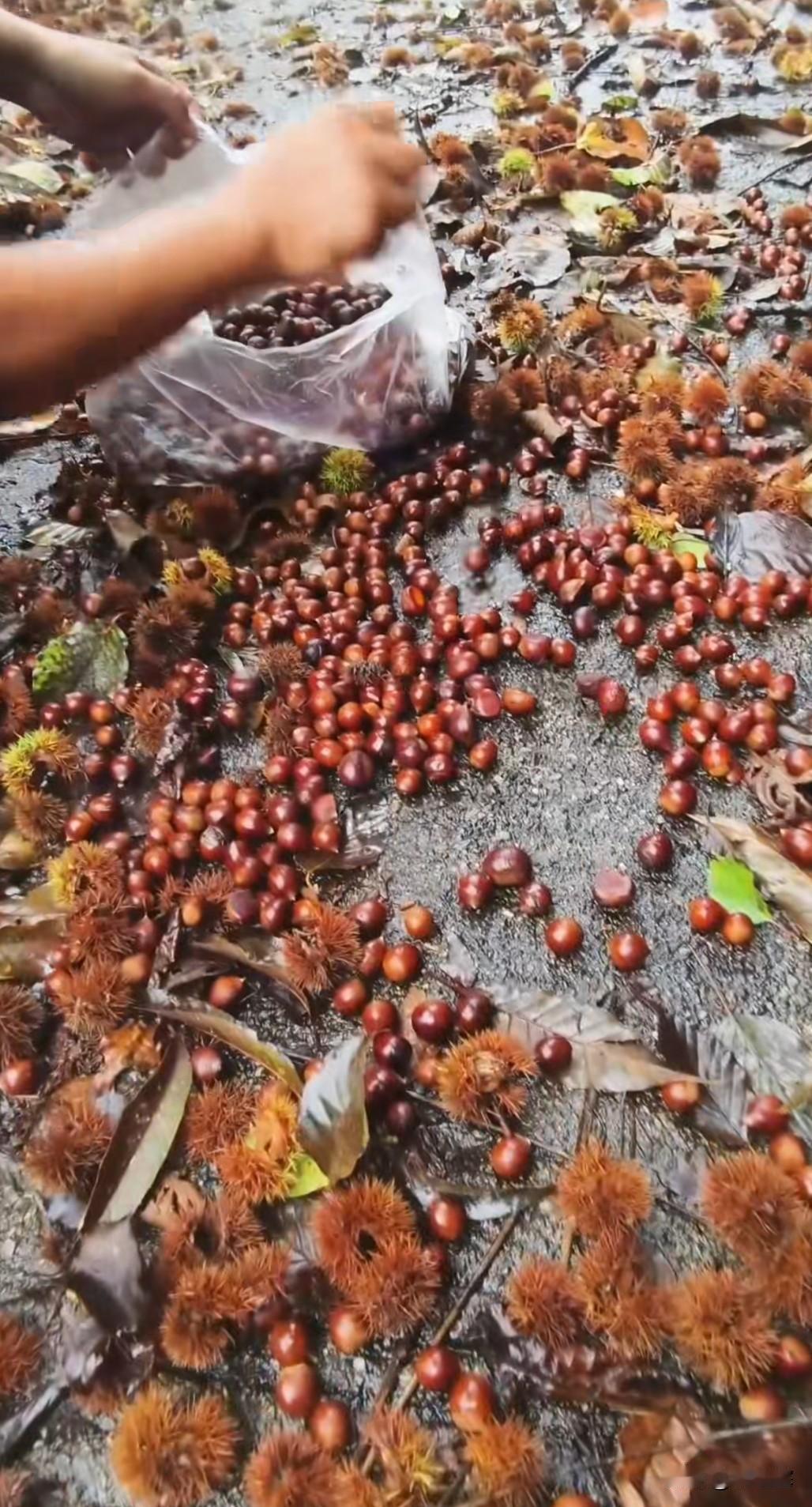 两夜秋霖落满途, 栗香匝地野风酥。 俯身拾得玲珑果, 一捧乡愁入袋无。板栗