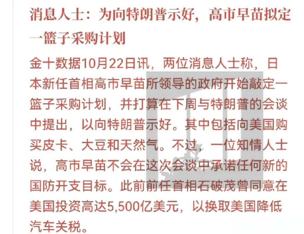 高市早苗上任第一天就给川普送了大礼,中国不买的大豆,日本要吃下去,而且不止大豆,还要买美国的天然气和皮卡,川普估计心里乐开了花。这一举动,瞬间在国际政治经济舞台上激起千层浪。 在高市早苗上任前,日本与美国的贸易关系就已错综复杂。多年来,双方在农产品、工业制品等领域既有合作又有竞争。此次高市早苗的大动作,无疑是在既有的贸易格局上投下了一颗重磅炸弹。 川普向来以独特的“交易艺术”闻名于世。就拿之前他与某国的贸易谈判来说,他巧妙地利用对方的痛点,通过提高关税等手段,迫使对方在贸易条款上做出让步,最终为自己国家争取到了更有利的贸易条件。此次面对高市早苗的“听话”,以川普的风格,很可能会得寸进尺。 日本国内对高市早苗此举的舆论反应不一。一部分人认为这是日本加强与美国关系的重要举措,有助于在国际事务中获得更多支持;但也有不少人担忧,如此大规模地购买美国产品,可能会对日本国内相关产业造成冲击,影响日本的产业自主性。比如日本的农业,若大量进口美国大豆,本土大豆种植户的生存空间将被进一步压缩。 美国豆农及其他相关产业对日本的购买行为自然是满心期待。对于豆农来说,稳定的订单意味着收入有保障,不用担心农产品滞销的问题。而美国的天然气产业和皮卡制造商,也看到了拓展海外市场的巨大商机。他们希望借助日本的购买,进一步提升在国际市场上的份额和影响力。 从国际经济格局来看,这一贸易事件可能产生深远的潜在影响。在全球经济一体化的大背景下,各国之间的贸易联系日益紧密。 日本大规模购买美国产品,可能会改变原有的贸易平衡,引发其他国家的连锁反应。比如一些国家可能会担心日本减少从自身的进口,从而调整自己的贸易策略。 回顾高市早苗与石破茂在贸易政策上的过往分歧,石破茂面对美国提出的投资 5500 亿美元要求时没有答应,而高市早苗却如此积极地迎合美国。 这背后或许反映了日本政坛不同势力在对外贸易政策上的理念差异。石破茂可能更注重日本的产业安全和经济自主性,而高市早苗则希望通过与美国的紧密合作,提升日本在国际舞台上的地位。 目前,这一事件仍在持续发展。高市早苗的“听话”究竟会给日本带来怎样的利弊,川普是否会进一步提出更苛刻的要求,都还是未知数。但可以肯定的是,这一贸易举动已经成为了国际社会关注的焦点,其后续发展必将对国际政治经济格局产生不可忽视的影响。 作为自媒体工作者,我认为在国际贸易中,各国都应在维护自身利益的基础上,寻求合作共赢,而不是盲目地迎合一方,否则最终可能会损害自身的长远发展。 文章描述过程、图片都来源于网络,涉及版权或者人物侵权问题,或有事件存疑部分,联系后即刻删除或作出更改