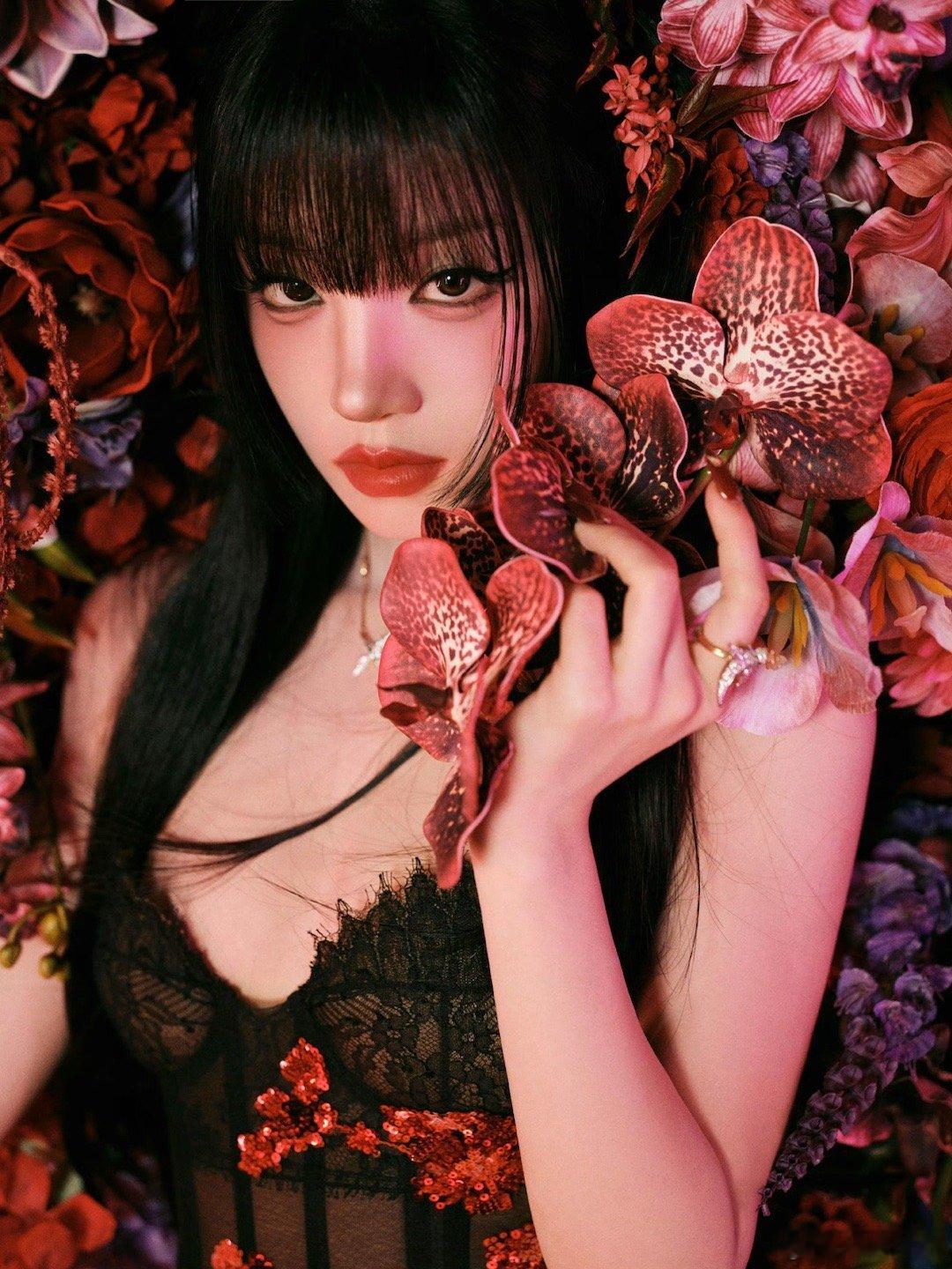 宋雨琦VOGUE盛典出发图 暗黑系美学在此刻具象化,蕾丝、亮片、公主切等元素巧妙融合。红唇勾勒出恰到好处的弧度