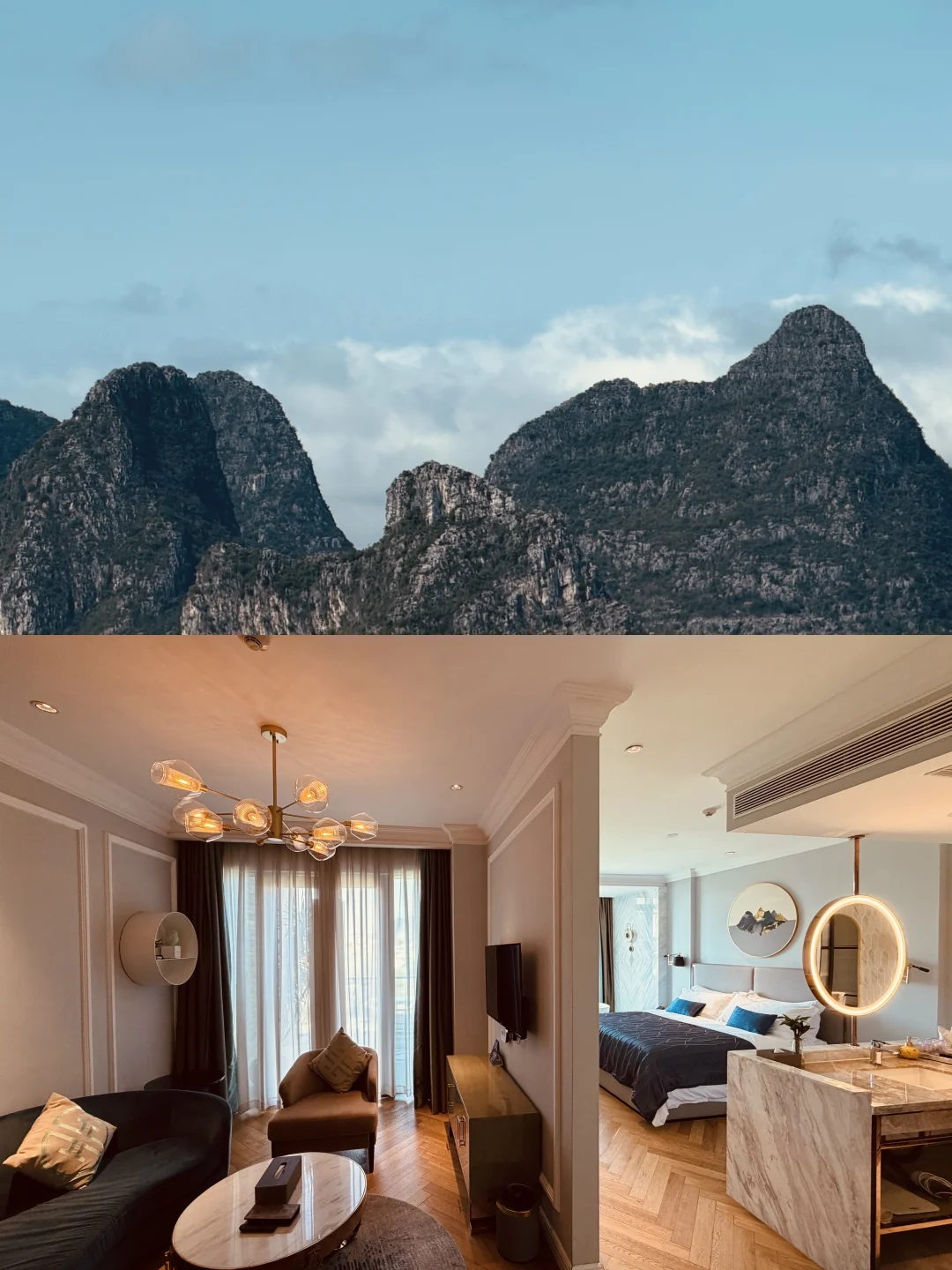 最惊喜的是,从房间就能直接看到桂林群山!每天醒来推开窗就是一幅山水画,体验感拉满!