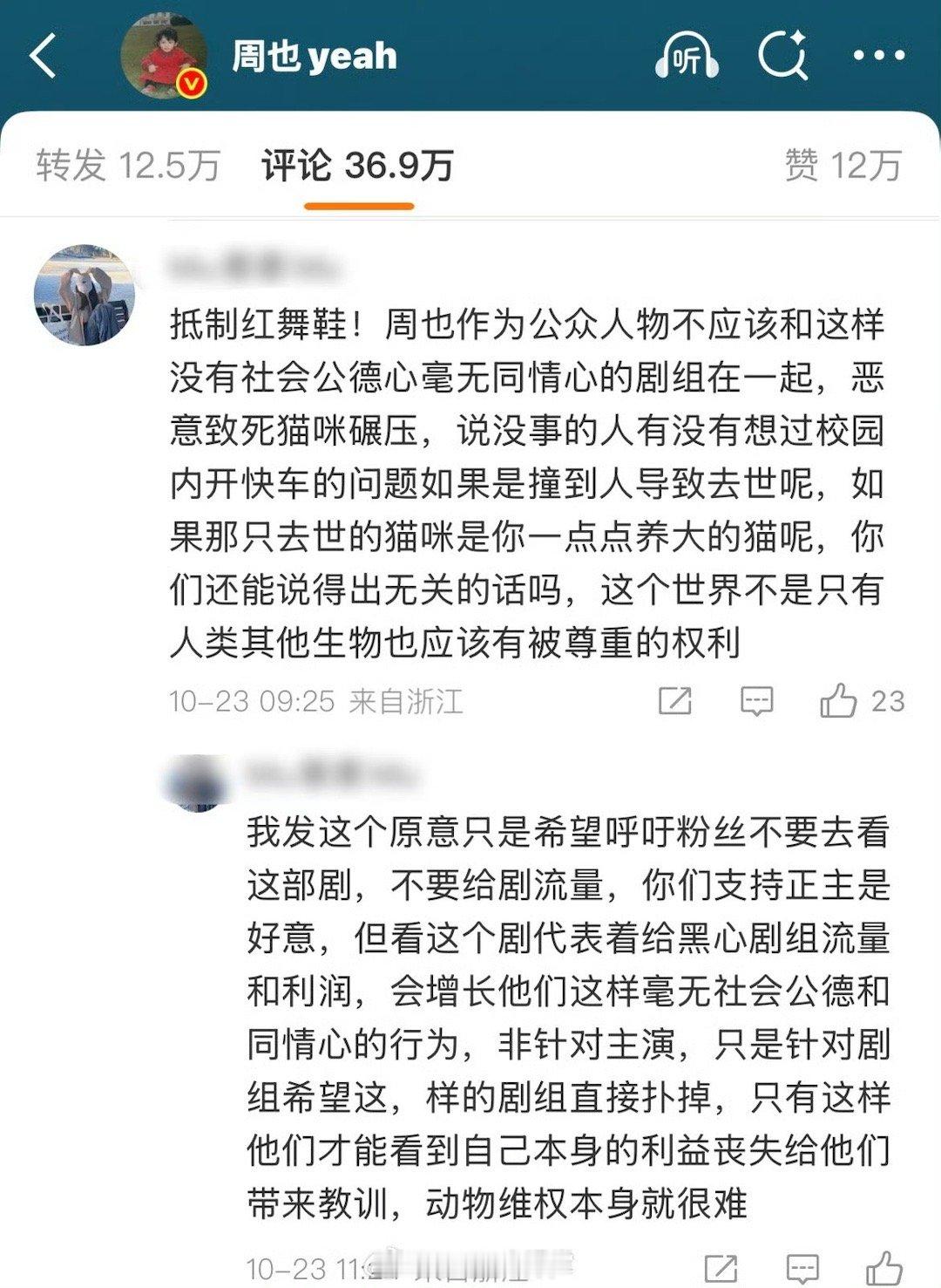 红舞鞋剧组的车进校园,压死了校园小橘现在网友都跑去周也的评论区要求道歉