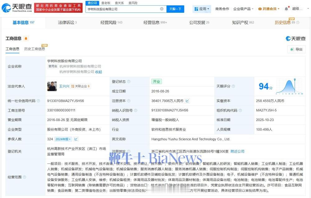 该公司成立于2016年8月,法定代表人为王兴兴,注册资本约3.64亿人民币,经营范围包括智能机器人的研发、智能机器人销售、工业机器人制造等。股东信息显示,该公司由王兴兴、汉海信息技术(上海)有限公司、宁波红杉科盛股权投资合伙企业(有限合伙)等共同持股。变更记录显示,今年5月,该公司名称由“杭州宇树科技有限公司”变更为“杭州宇树科技股份有限公司”。