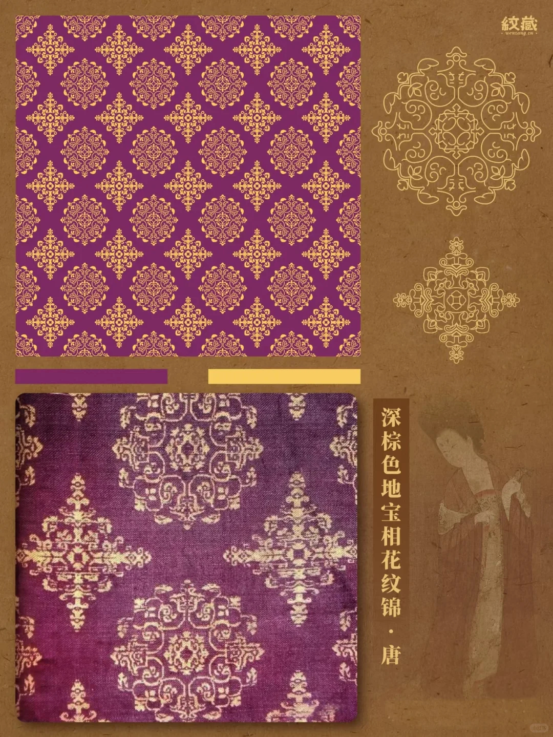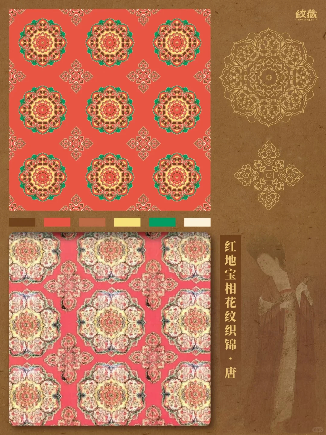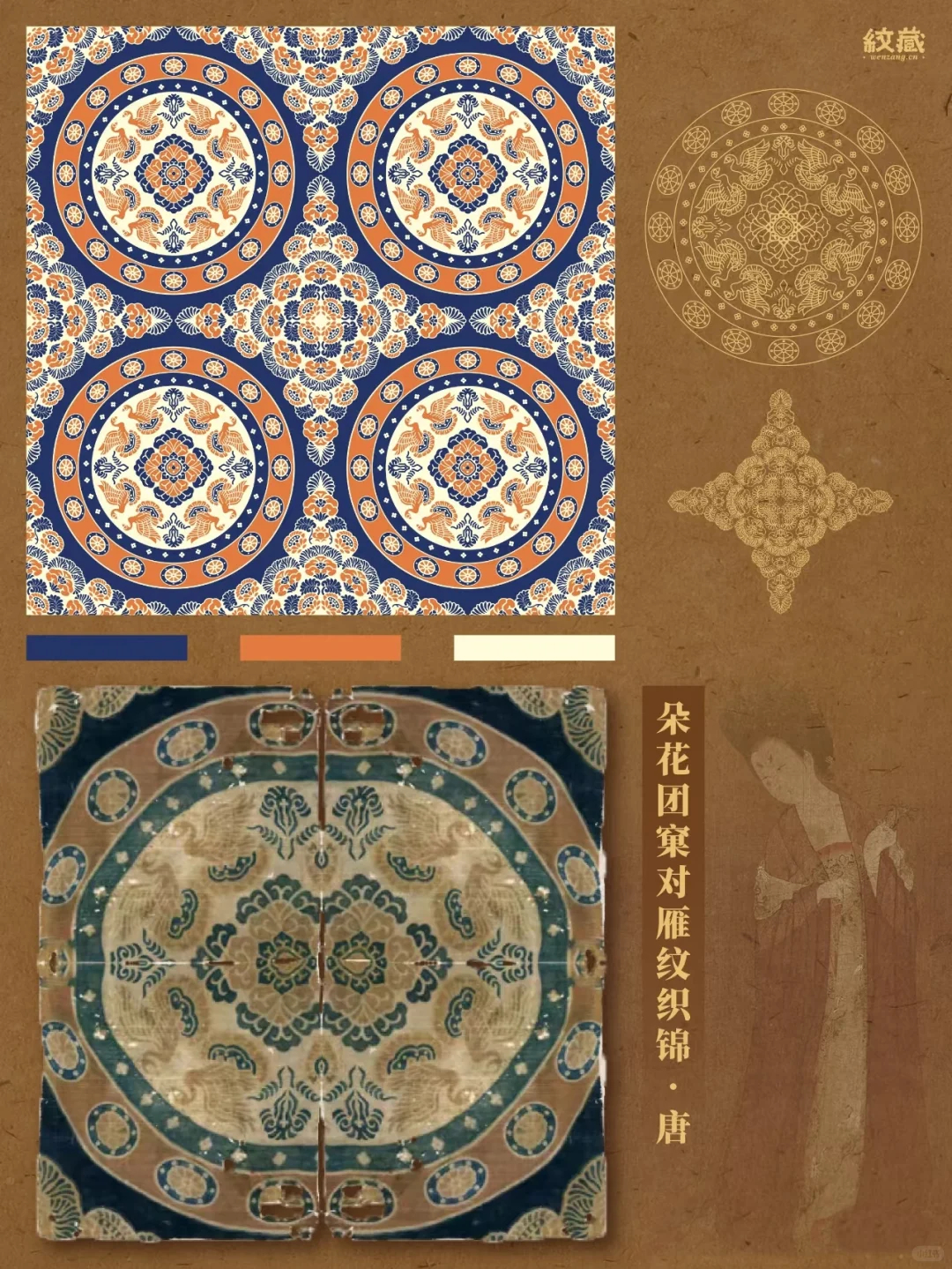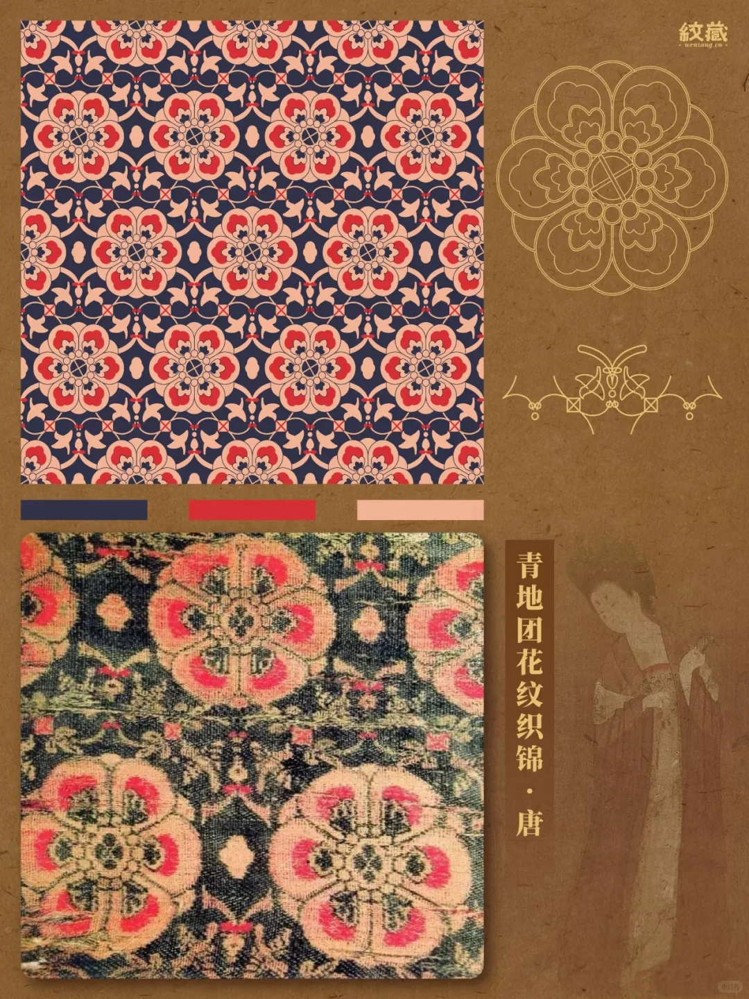 唐代各个民族相互融合,中外文化相互交流,使纹样艺术体现的更加丰富、富丽、华贵。唐代纹样的发展与社会、文化的变迁密切相关。初唐时期社会稳定,艺术风格受前代影响;而盛唐时期国力强盛,艺术呈现出繁荣富丽;中唐时期文化繁荣,纹样更趋向于写实;晚唐时期社会动荡,纹样呈现出更加抒情和高雅的特点。(cr.纹藏)