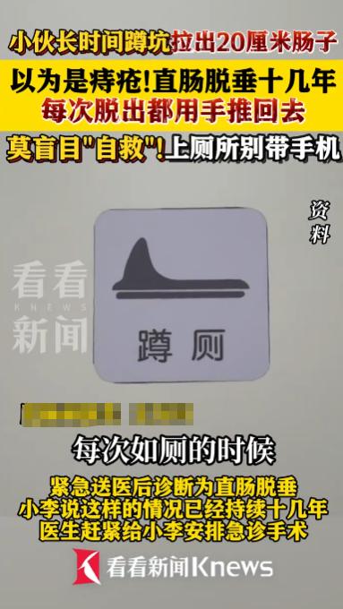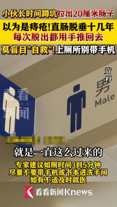 “离了个大谱!”2025年10月,广东佛山,一22岁小伙蹲坑拉出20厘米肠子被紧急送医,小伙出现直肠脱垂已经多年,每次他都以为是痔疮用手推回去,网友:还好没以为是蛔虫拉出来看看! 生活中有很多人喜欢蹲坑时看书或者玩手机,大家都知道这种不良生活习惯很大概率会长痔疮,但除了长痔疮之外,还有可能会导致更加可怕的疾病! 一小伙有个烦恼,上厕所时“痔疮”总是跑出来,他每次都会自己再推回去,这种情况已经持续十多年,由于小伙的身体没有特别不适,他也一直拖着没去医院看。 一次如厕时,小伙竟然拉出了20厘米的肠子,情况十分危急,他被紧急送往医院,小伙到这时这才意识到这些年来掉出的根本不是什么痔疮,而是自己的肠子! 据医生所说,小伙这是直肠脱垂,是不良生活习惯和个人基因共同导致的,因为小伙的误判与他长时间的盲目“自救”行为,病情没有得到及时控制,才发展到今天这一步。 不少网友庆幸小伙没以为是蛔虫拉出来看看,上厕所时尽量不要带书或者手机,如厕时间最好控制在3-5分钟,如果身体出现异常一定要及时就医,不要盲目自救! 信息来源:《小伙长时间蹲坑拉出20厘米肠子 以为是痔疮!十几年每次脱出都用手推回去》看看新闻