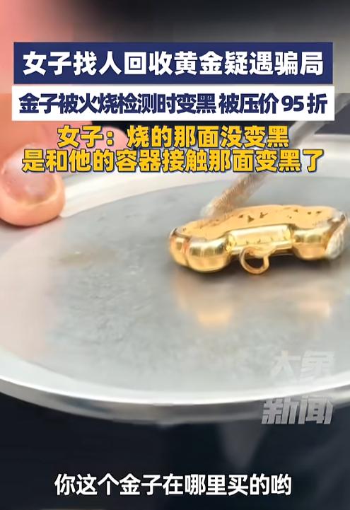 “防不胜防!”10月21日,四川成都,一女子找人回收黄金首饰疑似被做局,回收商家用火烧后金饰背面开始发黑,他称金子有杂质只能95折收,女子心生疑虑就没卖,网友:要是真不纯他根本不会收! 金价攀高,很多人都想趁机将自己手中的黄金变现,但是找人回收黄金时可一定要小心谨慎,别最后被人卖了还帮人数钱! 一女子见金价暴涨,便将自己的金吊坠送去回收,回收商家当着女子的面用火烧这些金首饰,没想到吊坠经过火烧后局部开始发黑。 回收商家见状,先是询问金子在哪买的,随后告诉女子这金吊坠不纯,自己只能95折帮忙收,女子有些不敢相信,将发黑的吊坠拿起来仔细查看。 只见金吊坠正面完好,只有背面发黑,可女子记得商家用火烧的是正面,当时这个金吊坠的背面紧贴着商家的容器,她感觉容器可能有点问题。 女子感觉事有蹊跷,想了想还是没有将金首饰卖给这个回收商家,她怀疑自己被做局,将这段回收经历分享到了网上。 不少网友认为如果黄金真的不纯,商家压根就不回收,有人提出有可能是商家的容器和手上都沾有洗洁精,洗洁精接触金子后再经过火烧就会发黑,不管真相如何,回收黄金时一定要选择靠谱的商家,小心谨慎些总没错! 信息来源:《女子找人回收黄金疑遇骗局,金子被火烧检测时变黑,被压价95折》大象新闻