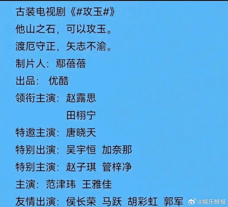 网传赵露思、田栩宁将合作👖S+项目《攻玉》,这个阵容你期待吗?