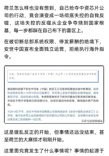 当初乌克兰将我们收购的马达西奇公司收归国有,我们居然没有采取任何有力反制,这也间接鼓励了一些西方列强对中资虎视眈眈,存觊觎之心,荷兰只是第二个尝试抢劫者,如果这次再不将他打痛冶服,杀鸡儆猴,那么中国在海外几万亿的资产将血本无归。 之前乌克兰马达西奇公司那事,很多人至今觉得可惜又无奈。这家被称为 “动力沙皇” 的企业,是苏联留下的航空工业宝贝,能造飞机发动机,可 2014 年俄乌关系恶化后,它丢了俄罗斯市场,很快就资金链断裂,连工资都发不出,眼看就要破产。 2016 年,咱们国内的天骄航空公司找上门,想收购它 56% 的股份,前期一下投了 3 亿多美元,还答应两年内再追加 5.5 亿,就盼着能引进技术、帮企业复工。 可没想到,美国从中作梗,逼着乌克兰反垄断委员会叫停了交易。等到 2022 年泽连斯基上台,直接下了法令把马达西奇收归国有,咱们那笔前期投资彻底打了水漂。 天骄公司没办法,只能去海牙常设仲裁法院告状,要求乌克兰赔 45 亿,可那会乌克兰正打仗,俄军的炸弹把马达西奇几十座厂房炸成了废墟,90% 的厂区都毁了,别说公司没了,整个乌克兰连吃饭都得靠援助,根本没钱赔。说实话,当时咱们除了仲裁也没拿出更硬的反制办法,最后这事儿只能认栽,等于吃了个哑巴亏。 正因为马达西奇这事没拿出有力的说法,才让有些西方国家觉得中资企业的资产好拿捏,荷兰今年就跟着学了样,把手伸向了咱们的安世半导体。 这家公司可不是小作坊,原本是飞利浦的部门,后来被恩智浦剥离,2019 年被咱们的闻泰科技全资买下来,总部在荷兰奈梅亨,2024 年的收入就有 147 亿,占了闻泰总营收的六分之一,全球汽车和消费电子用的基础芯片,很多都是它造的。 今年 9 月底,荷兰政府突然以 “保障供应链安全” 为借口,下了部长令,不让安世半导体动资产、调人员,有效期一年。 更过分的是,没过几天当地法庭就免了咱们派去的 CEO 张学政的职务,找了个外人当董事掌实权,还把几乎所有股份都交给第三方托管。 后来法院文件曝出来,早在 6 月美国就给荷兰施压,说想让安世摆脱美国的管制,就得换掉中国 CEO,这明摆着是美国指挥、荷兰动手,跟抢没两样。 不过这次跟马达西奇那会不一样,咱们没等着吃亏,很快就拿出了反制措施。10 月初,商务部直接下了禁令,不让安世半导体在中国的子公司和分包商出口特定成品和组件。 要知道,安世 70% 的产品都是在东莞工厂封装的,这一下欧洲车企立马慌了,欧洲汽车制造商协会专门警告荷兰,说用于电动车窗、雨刷的芯片库存只剩 3 周,再断货整车生产线几周内就得停摆,连福特、现代在欧洲的工厂都受影响。 更关键的是稀土管制,咱们把稀土开采、冶炼分离的技术都纳入出口限制,只要产品里含 0.1% 以上中国原产的稀土,就得拿中方许可。荷兰的 ASML 公司是全球唯一能造先进光刻机的,它的机器里用的钕铁硼磁体含 0.3% 的镝元素,刚好到管制阈值,库存只够维持 6 到 8 周生产。瑞银测算过,2025 年 ASML 在中国的收入得降 24%,后年还得降 11%。 这两下下去,荷兰立马扛不住了。10 月 21 日,荷兰经济大臣主动给咱们商务部部长打电话求沟通,说想找建设性的解决方案,欧盟贸易委员也跟着视频会谈,想帮忙协调。 之前荷兰还喊 “欧洲技术必须留在欧洲”,现在态度全软了,这就是打痛了才管用。 要知道,咱们在海外的资产数额巨大,这些年企业走出去投了不少钱,要是都像马达西奇那会任人拿捏,真可能血本无归。 现在西方不少国家都爱拿 “国家安全” 当借口,比如荷兰不光抢安世,还把 ASML 的 1970i、1980i 这些不算最尖端的光刻机也纳入出口审批,2023 年咱们进口的 87.4 亿美元光刻机里 83% 来自荷兰,这就是卡咱们的脖子。 马达西奇的教训已经够深刻了,当时没硬反制,就让别人觉得中资好欺负。荷兰这事幸亏出手快,掐住了他们依赖稀土、依赖中国产能的要害,才让他们服软。 这也说明,对付这种明着抢资产的行为,必须拿出真本事,把他们打痛了,其他想跟风的国家才会不敢动。 要是这次还像上次那样没动静,以后不光欧洲,其他地方的中资企业可能都会被盯上,几万亿的海外资产哪有保障? 现在荷兰主动求沟通,就是反制起了效果。这不是要跟谁对着干,而是得让别人知道,咱们的资产受不得欺负,想靠政治手段抢利益,最后只会自己吃亏。毕竟全球化时代,荷兰要靠中国稀土,欧洲要靠中国造的芯片组件,真闹僵了谁也没好处。