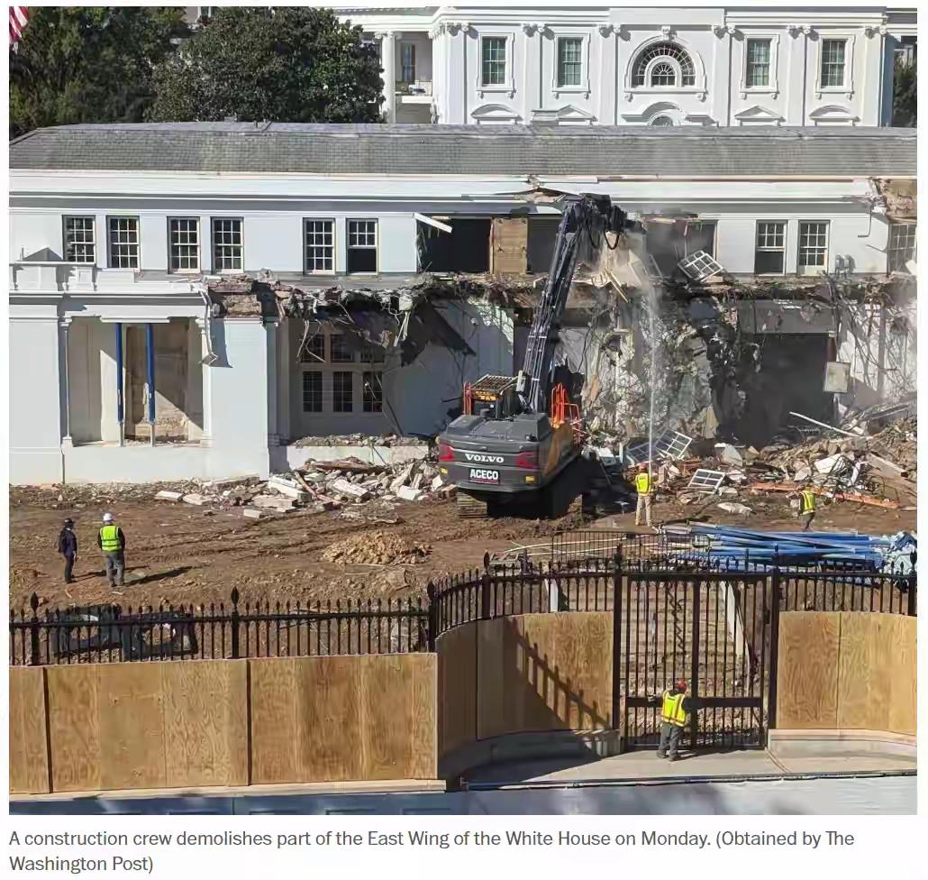 特朗普是真牛,比华尔街的牛还牛。 10月20日,他宣布把白宫的东配楼拆了,要建一个豪华宴会厅。白宫东翼楼建于1902年,这座有着百年历史的建筑,在政府停摆的时候,被挖掘机拆除了。不过,他宣称这项工程不用政府掏钱,完全由他和私人捐助者出资。 新改建的豪华宴会厅有8000平米,斥资2亿多美元。看来,在美国当总统需要有钱,有钱就可以自己说了算。这或将成为特朗普留在白宫的永久的印记!