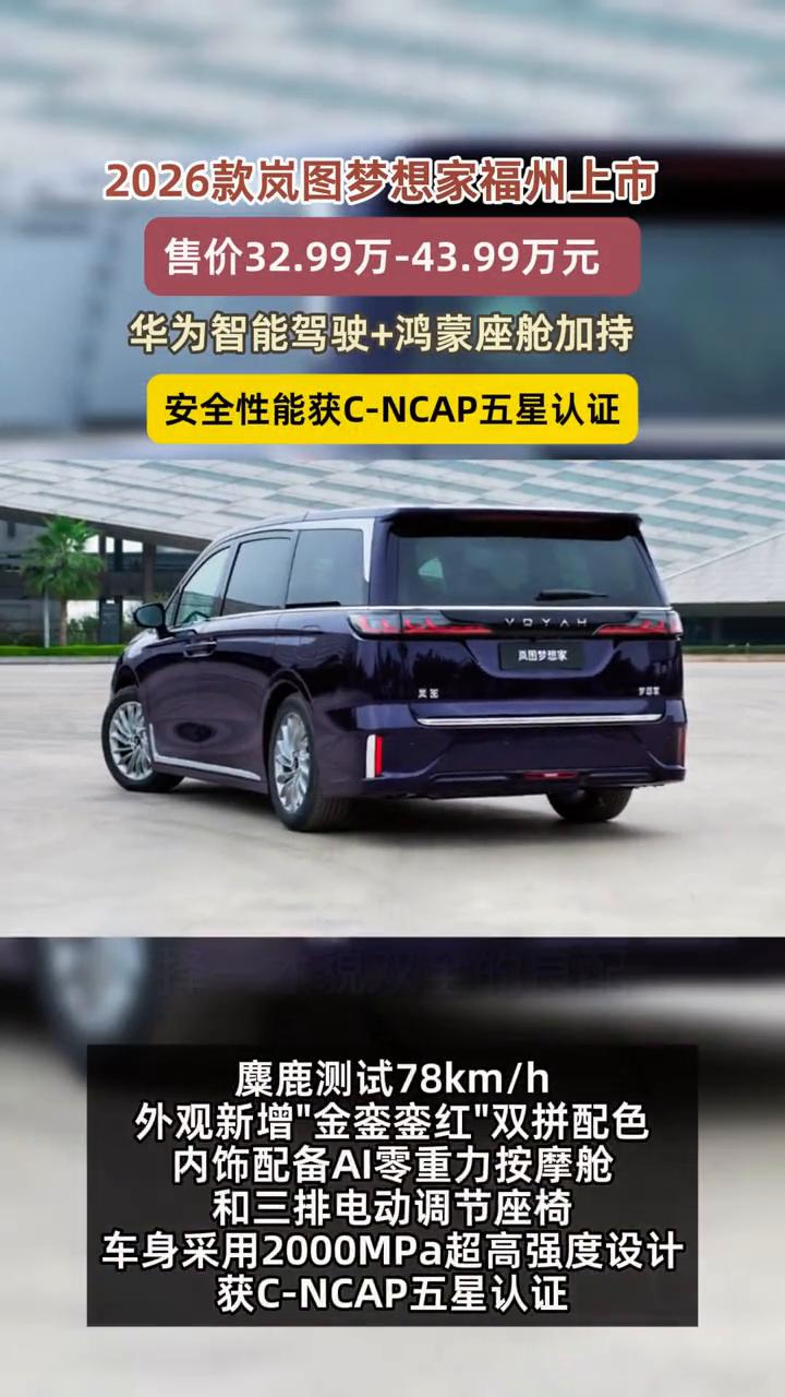 2026款岚图梦想家福州上市,售价32.99万-43.99万元。 华为智能驾驶+鸿蒙座舱加持,安全性能获C-NCAP五星认证。新车搭载华为ADS4智能驾驶和鸿蒙座舱5,采用WEWA技术架构,提升安全性。配备智能后轮转向和蟹行模式,麋鹿测试78km/h。外观新增"金銮銮红"双拼配色,内饰配备AI零重力按摩舱和三排电动调节座椅。车身采用2000MPa超高强度设计,获C-NCAP五星认证。