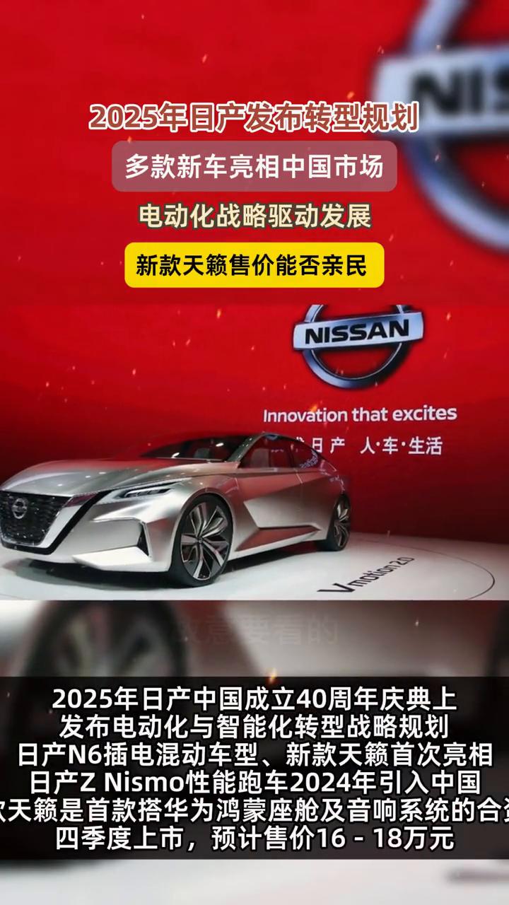 2025年日产发布转型规划,多款新车亮相中国市场,电动化战略驱动发展,新款天籁售价能否亲民? 2025年日产中国成立40周年庆典上发布电动化与智能化转型战略规划,日产N6插电混动车型、新款天籁首次亮相。 日产Z Nismo性能跑车2024年引入中国,天籁是首款搭华为鸿蒙座舱及音响系统的合资车型,四季度上市,预计售价16-18万元。 日产N6基于天演架构,纯电续航超150公里,插电混动皮卡越野性能佳。 自1973年入华,日产历经多阶段发展,已将中国定位为全球电动化转型核心支点。