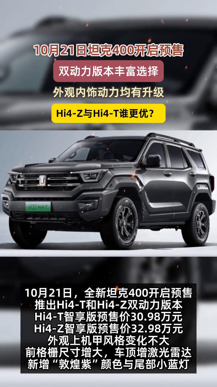 10月21日坦克400开启预售,外观、内饰、动力均有升级,Hi4-Z与Hi4-T谁更优? 10月21日,全新坦克400开启预售,推出Hi4-T和Hi4-Z双动力版本。Hi4-T智享版预售价30.98万元,Hi4-Z智享版预售价32.98万元。 ·外观上机甲风格变化不大,前格栅尺寸增大,车顶增激光雷达,新增"敦煌紫"颜色与尾部小蓝灯。 ·内饰采用多屏搭配,换装怀挡,有无线充电面板等。辅助驾驶支持城市和高速NOA功能。 ·动力上,Hi4-Z越野能力好,纯电续航200公里。