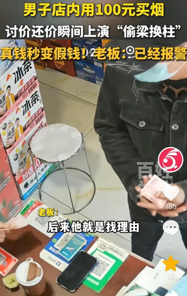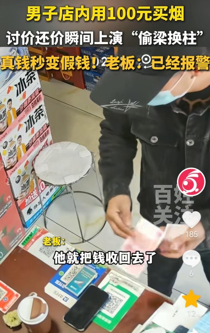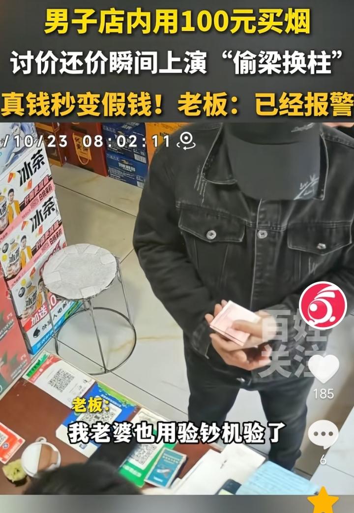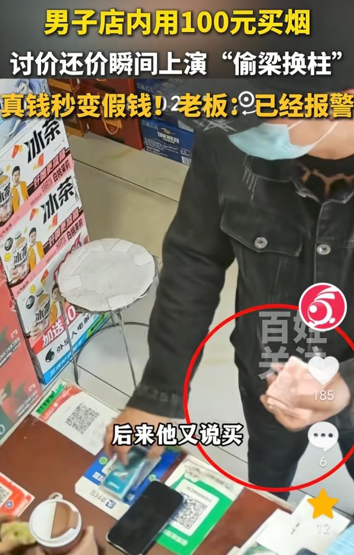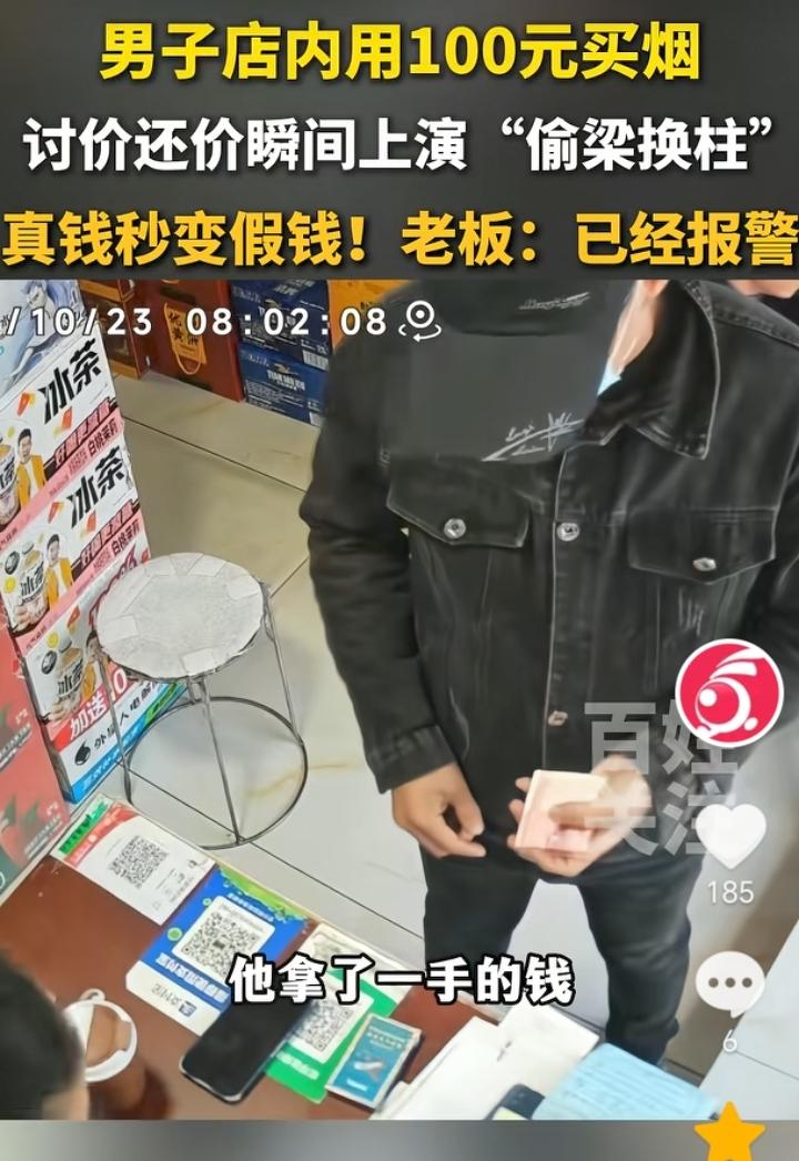 “偷梁换柱”!江苏盐城,男子头戴鸭舌帽,嘴上戴着口罩,在店里用100元买烟为由上演“偷梁换柱”。 据百姓关注报道,10月23日江苏盐城,男子头戴鸭舌帽嘴上戴着口罩,手里拿了一踏百元钞票正面是真钱,反面是假钱,他拿着钱去店里用100元买烟为由,开始给了100元真钱,老板娘检验了没问题,后面男子又找各种理由讨价还价收回了已经验过的100元,后面又说买,于是就把真钱换成假钱,结果买了20元的烟,老板娘还找了80元的真钱给男子。 男子这头戴鸭舌帽嘴上戴着口罩,很明显也是有备而来,他这换钱手法也是娴熟,一看就是一个惯犯,老板娘可能也是没有想到对方竟然“偷梁换柱”,结果不仅赔了80元而且还搭出去了一包烟。 真是防人之心不可无,人与人之间的信任就是被这种人给消耗了。 这件事也是给做生意的人提了醒,收钱的时候一定不要掉以轻心,以防被有心之人骗。