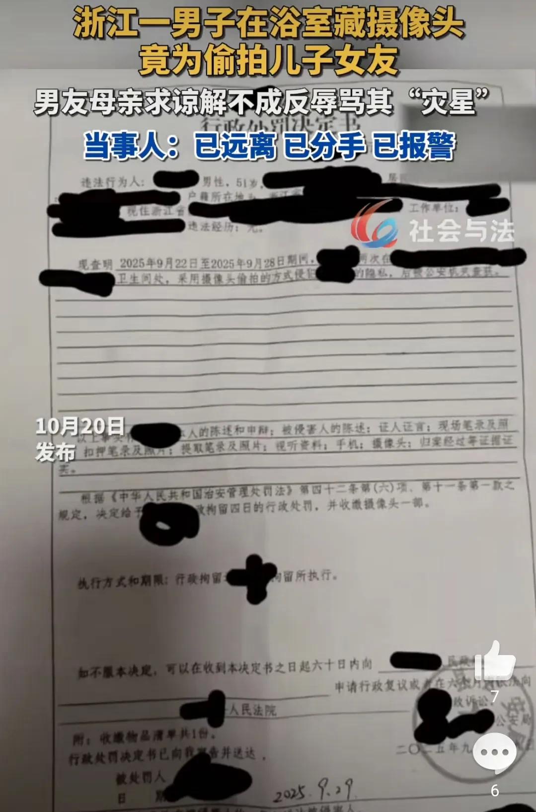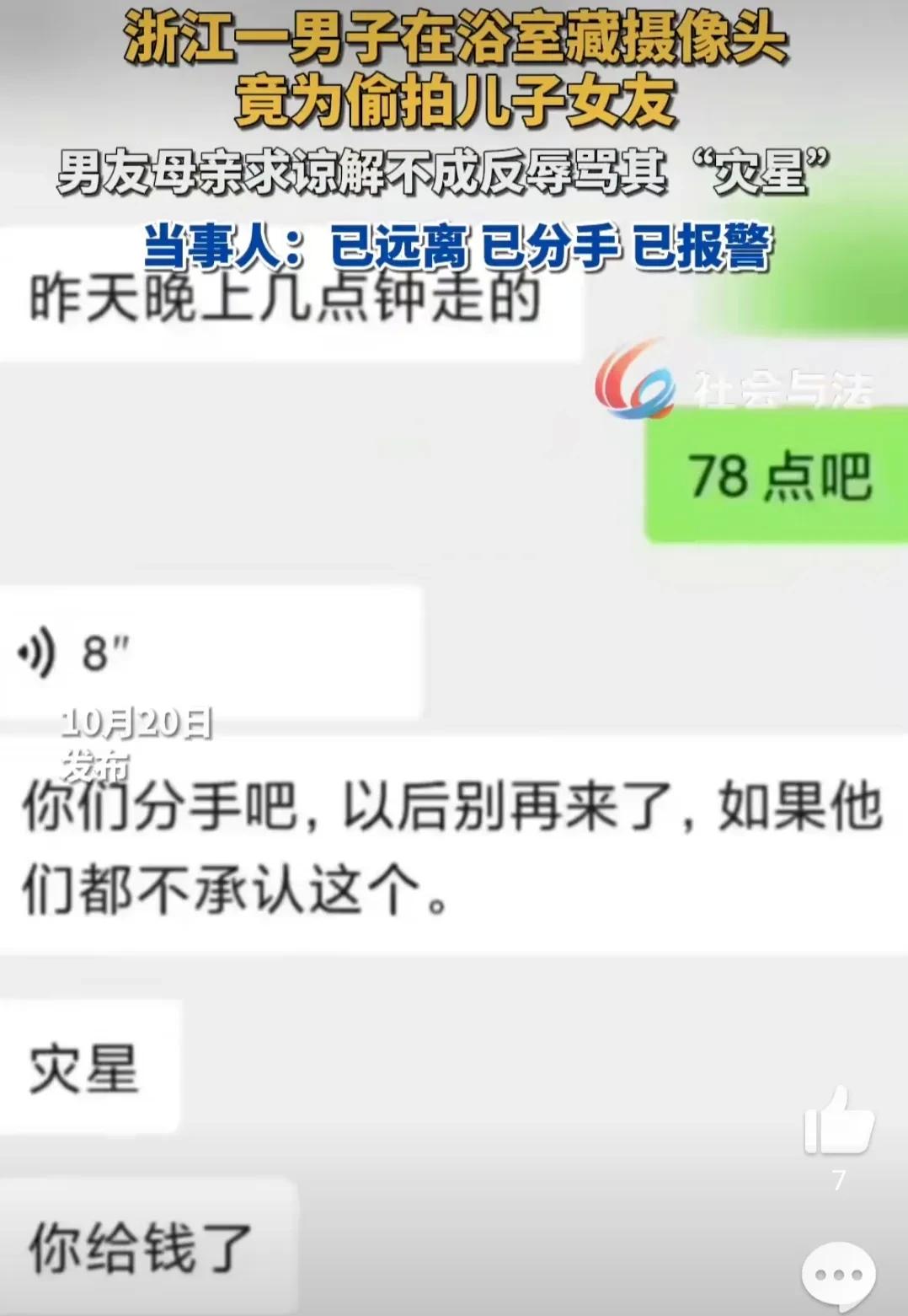 浙江一男子在浴室藏摄像头 竟为偷拍儿子女友 最近听说一户人家出了怪事,男的把剃须刀改装,偷偷拍未来儿媳妇洗澡被抓了。结果他老婆不但不劝架,反而跑去对儿媳妇说“别计较”,还信口开河喊人家“灾星”。 警察把男人带走后,周围邻居都说这事看着怪,毕竟偷拍这事太下作了。倒是那老婆一直护着男人,有街坊怀疑她是不是被洗脑了,就像那种被绑架还帮着坏人说话的人。 现在网上有人说这夫妻俩可能是想掩盖家里别的事,也有人在讨论现在电子产品太方便偷拍了,连剃须刀都能改造成监视器。案子还在查,暂时没结论,不过确实让人摸不着头脑。