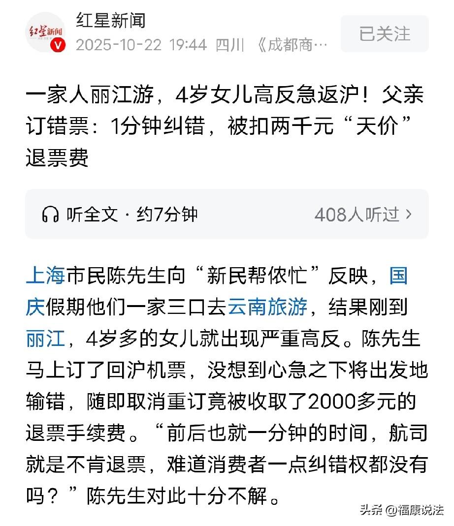 上海一男子和妻子带着4岁女儿到丽江旅游,不料刚到,女儿突然呕吐、心率很快,查出严重高反,医生建议快回上海,因为高原缺氧会导致心肌损害,男子急忙订机票,情急之下,脑子有些昏沉,订票时错把出发地选成了大理,可他们一家三口人在丽江,他赶紧取消申请,也就一分钟时间,他和妻子的机票还是被扣了2090元退票手续费,男子觉得航空公司“一刀切”收费,不给一点纠错时间,不太不合理,而结果让他有些意难平。 陈先生打算趁国庆假期带着老婆和4岁女儿来个7天云南游,可没想到,计划没有变化快,意外发生了。 10月4号,陈先生一家三口从上海坐飞机来到了丽江,准备10月10号再从大理飞回上海。 4号晚上,陈先生一家三口游玩后,吃了晚饭就回酒店休息,不曾想,后半夜4点多,4岁的女儿突然哭闹,她心率变得很快,还一直呕吐,看起来特别难受。 陈先生夫妻俩吓得赶紧连夜把女儿送到医院。 经过一系列检查,医生告诉他们,女儿是“高海拔效应”也就是高原反应,还建议他们赶紧带孩子回上海,因为高原缺氧会导致心肌损害。 为了女儿的健康着想,陈先生在医院里心急如焚,马上在旅游平台搜索,想订当天最快返回上海的航班。 陈先生因为女儿情急之下,脑子有些昏昏沉沉,订票时一个没注意,就把返沪航班的出发地选成了大理,他刚下了单,立马反应过来不对,他们一家三口人还在丽江呢! 陈先生赶紧取消申请,前后也就一分钟时间。 让他万万没想到的是,就算他立即提交取消订单申请,约10分钟后,结果一出来他还是傻了眼。 女儿的机票被拦截成功,不过,他和妻子的两张成人机票还是正常出票了。 陈先生要是再申请退票,就得付2000多的手续费。 当时情况紧急,为了能尽快带女儿回上海,陈先生没办法,只能先退票,然后,他又重新下单买了3张从丽江回上海的机票,之后,他的云南之旅也全取消了。 此后,陈先生退掉了2张成人机票,退回2230元机票钱,还是被扣了2090元退票手续费。 对于扣除的2000多手续费,陈先生心中有很多疑问,第一,他下单后马上申请取消订单了,为啥3张机票只有女儿那一张拦截成功了? 第二,旅客不小心输错信息也是常见的错误,航空公司为啥一点犯错的空间都不给,“一刀切”收费,不太合理吧? 第三,陈先生觉得女儿因为病情严重,要尽快赶回上海,属于特殊情况,航空公司是不是该酌情考虑一下呢? 只是因为输入信息时一分钟的差错,就要承担像2000多块钱的大笔损失,这让陈先生觉得特别憋屈,难道不能多给一点纠错时间吗? 于是,陈先生找记者表达了自己的想法,也想看看某航空公司怎么说? 记者先联系了订票的旅游平台。 平台这么回应,说确实有这事,当天旅客在6点26分预定了大理飞上海的机票,2张成人的,一张儿童的,6点27分取消订单申请,只有儿童票取消成功。 不过,2张成人票取消失败,于6点29分出票,后来,旅客通过APP渠道自愿退票申请了退票1045元(一位),且成功了。 另外,平台还表示,退票费用是航空公司收的,儿童票拦截成功是因为出票速度比成人机票慢。 而后,记者又联系了某航空公司,一直没办法转人工电话。 据了解,关于“错购客票退改规则”,得按照相应退票规则扣款,没办法申请免费退票。 有人说,有医院证明退票不扣费用,不过只是孩子退票不扣,大人就要扣费用,自己的问题订错了就要承担。你购票时已说明退改费用的,自己心急犯的错误,航空公司肯定不会买单。 也有人说,对于退票,还是支持航空公司,没有规矩就不成方圆,人家已经明明白白把条款写清楚了,那只能自己错误只能自己买单,况且,出票不是人工,是电子系统自动生成的。 还有人说,退票也有个时间,别人在时间范围内退票就不应该收取这么高手续费。 引以为戒吧!以后网上购票一定要仔细,反复看清楚了才付款,特别是机票。 从法律层面来说,航空公司收取高额手续费的行为可能并不直接违反规定。 《公共航空运输旅客服务管理规定》第16条规定:承运人或者其航空销售代理人应当按照所适用的运输总条件、客票使用条件办理旅客自愿变更客票或者自愿退票。 但在陈先生这件事里,他是因为女儿突发严重高反,属于特殊紧急情况才需要退票,并非普通的自愿退票行为。 在这种情况下,航空公司“一刀切”地按照正常退票规则收取高额手续费,没有考虑到特殊情况的合理性,虽然不直接违反法律规定,但从情理和公平角度而言,缺乏一定的人文关怀。 从公平交易的角度看,陈先生在这种情况下并非出于主观意愿退票,而是因为女儿病情需要的客观原因。 航空公司没有根据特殊情况给予合理的处理,没有为消费者提供价格合理的交易条件,在一定程度上侵犯了陈先生作为消费者的公平交易权。 消费者在遇到类似特殊紧急情况时,理应得到更人性化的对待,而不是被机械地按照常规退票规则处理。 对此你怎么看呢? 关注@福康说法