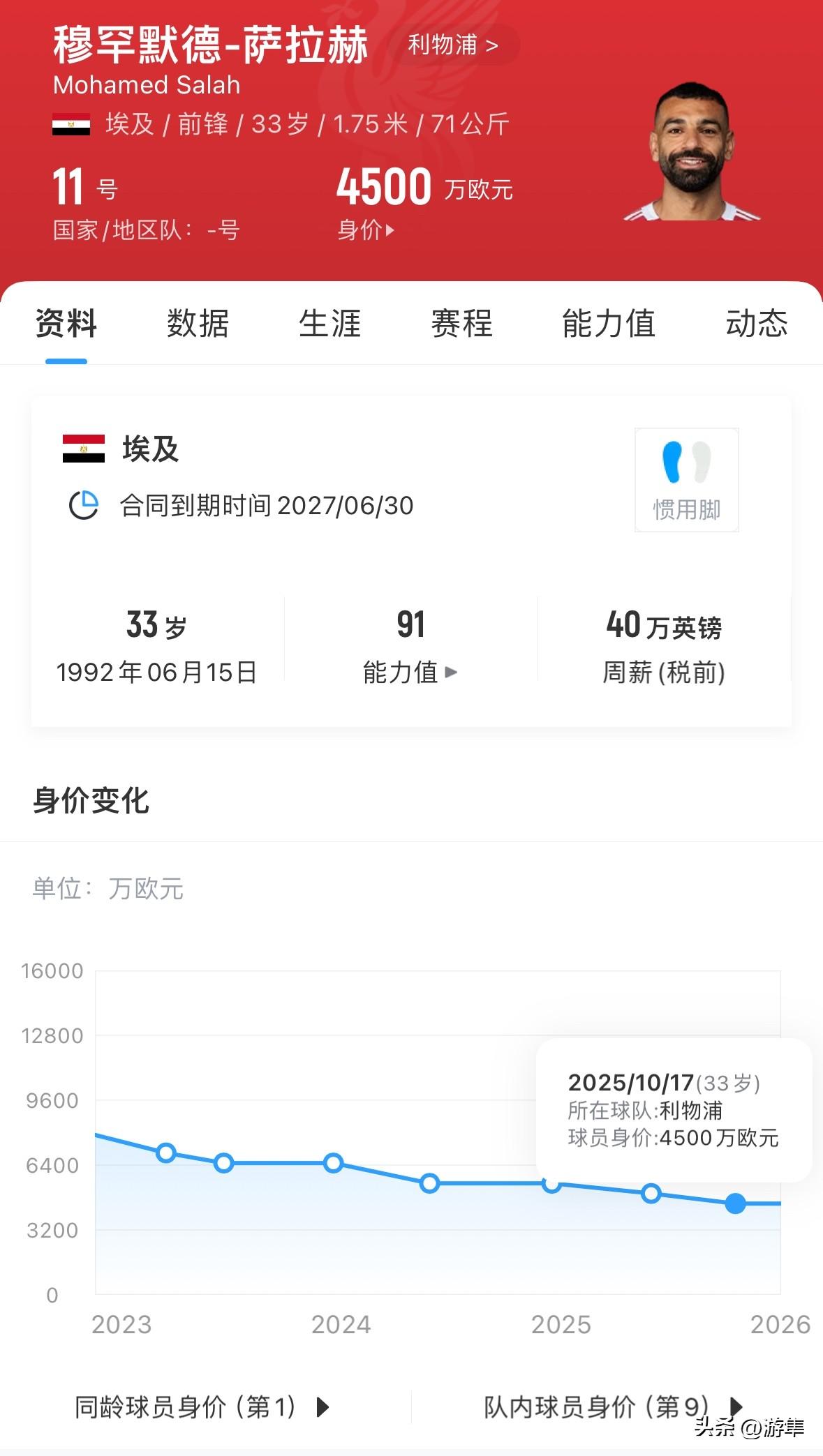 谁能想到!利物浦豪掷40万镑周薪续约33岁萨拉赫,本以为是“王者归来”,如今却成“队内隐患”?新赛季开赛仅7轮,法老0球0助攻,过人成功率暴跌一半,射门次数腰斩,昔日英超第一人如今门前频频哑火!球队遭遇三连败,两次被绝杀,进攻端毫无起色。更尴尬的是,主帅斯洛特竟不敢将他换下——因萨拉赫地位太高,动他恐引发更衣室动荡。高薪+核心身份让他牢牢占据首发,但表现却与薪资严重不符。当年克洛普时代说“萨拉赫不可替代”,如今斯洛特陷入“用他输球,不用更乱”的两难。33岁的老将,是否该让位新人?利物浦的争冠梦,正被这份天价合同拖入深渊?