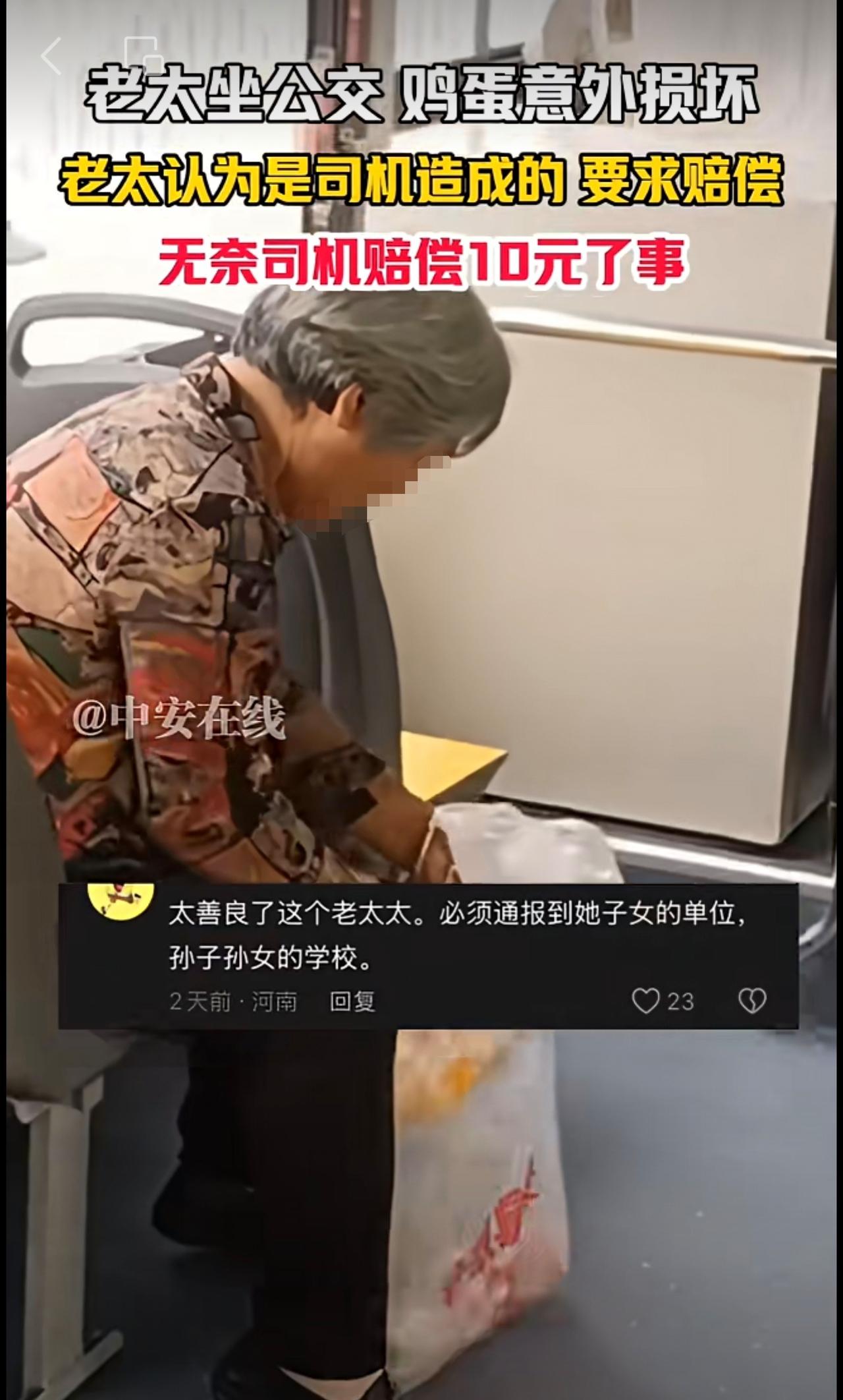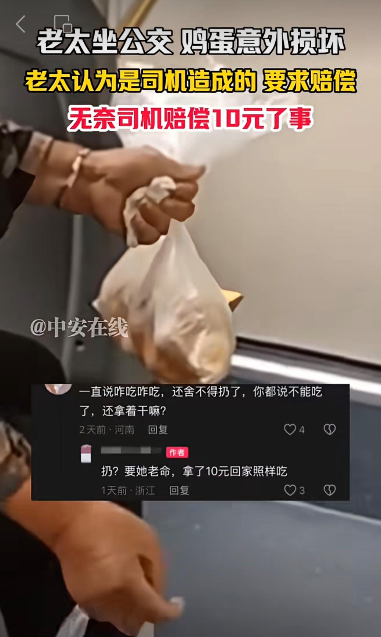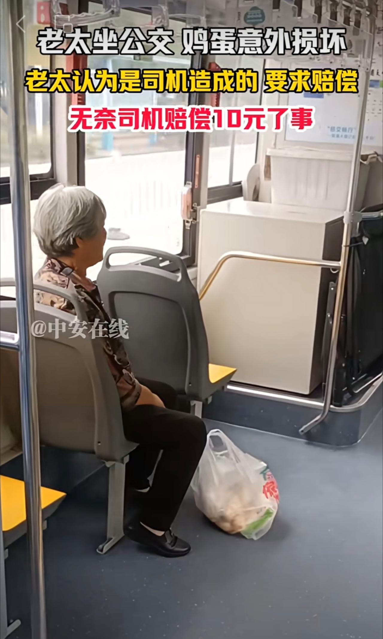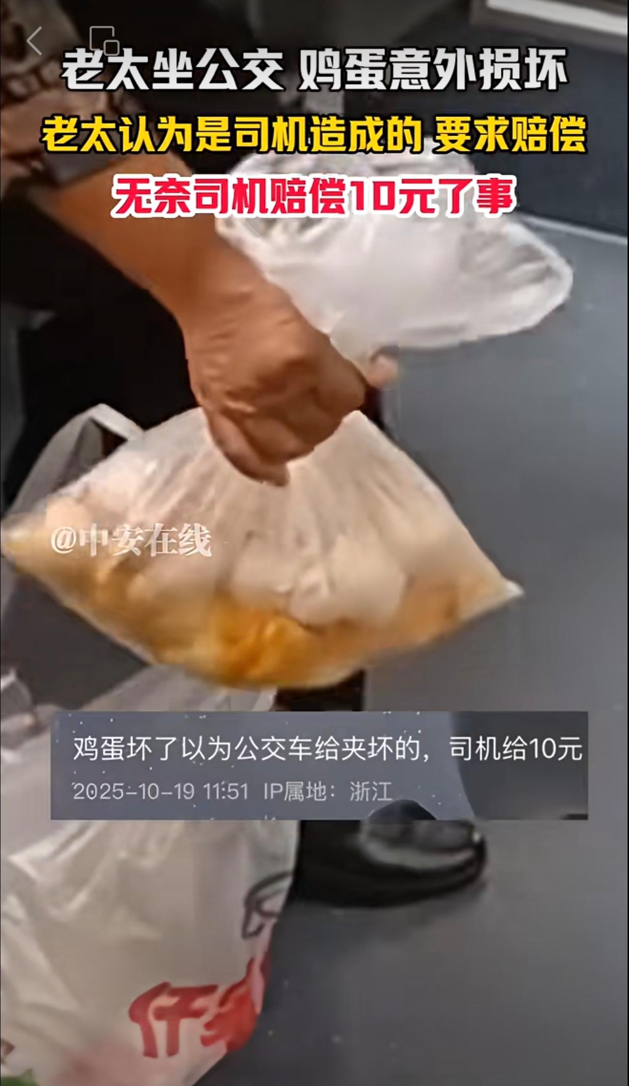 10月19日,(发布)浙江。老太坐公交 鸡蛋意外损坏,老太认为是司机造成的 要求赔偿,无奈司机赔偿10元了事。(编辑:昊昊)