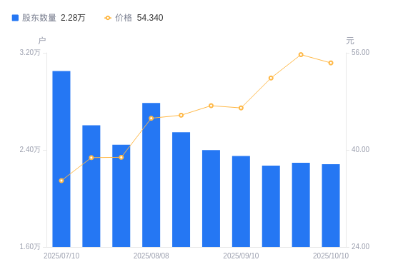 日期A股户数(户)流通A股户均持股数(股)户均持股市值(万元)2025-09-302294530213.29168.292025-09-192270830528.62158.292025-09-102349729503.51138.432025-08-292398128908.05136.712025-08-202546327225.54124.482025-08-082787224872.41112.472025-07-312442528382.55110.072025-07-182602326639.66103.182025-07-103049522733.0379.432025-06-302923523712.8182.64