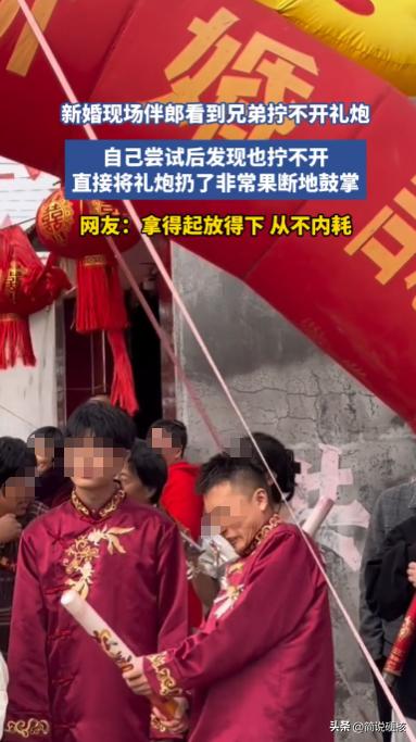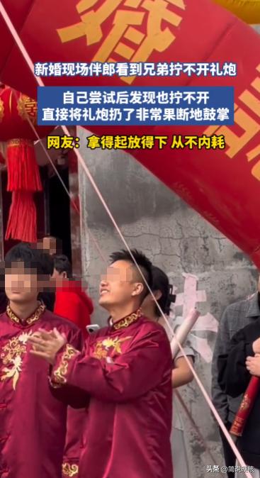 “人怎么能这么聪明!”10月22日,山东,一伴郎发现身旁兄弟拧不开礼炮,直接拿过来想耍个帅拧开,结果拧了半天发现自己也拧不开,他直接将礼炮扔在地上,果断用鼓掌代替,网友:拿得起放得下! 婚礼上通常会在新人入场时放礼炮庆祝,可要是礼炮这东西可能会出现各种意外,比如哑炮、没拧开等尴尬情况,很多人都不知在此时该怎样临场反应。 婚礼现场,一对新人马上进场,一伴郎发现一旁的兄弟怎么也拧不开手中的礼炮,他直接将礼炮拿过来,准备耍个帅拧开。 伴郎呲牙咧嘴铆足劲拧了一下,发现礼炮纹丝未动,身旁的兄弟一脸担心看向他,时间马上就要来不及了,不料伴郎尝试了半天还是没拧开。 眼见新人入场,伴郎的大脑飞速运转,直接将手中的礼炮扔在地上,脸上的表情迅速切换,随即微笑着鼓起了掌,以掌声代替礼炮,一番操作行云流水,就好像刚才什么都没发生。 不少网友被这名伴郎逗笑了,表示这人绝对拿得起放得下,从不内耗,不得不说,这名伴郎的临场反应能力也是一绝,普通人遇到这样的事可能会自责,但他用自己的机智轻松化解! 信息来源:《新婚现场伴郎看到兄弟拧不开礼炮,自己尝试后发现也拧不开》云观视角