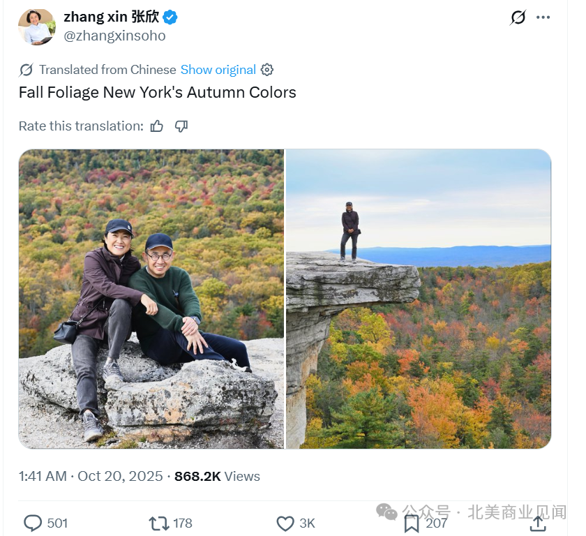 10月20日,潘石屹老婆张欣在X上发布了两张近照,并配文“纽约秋色”。