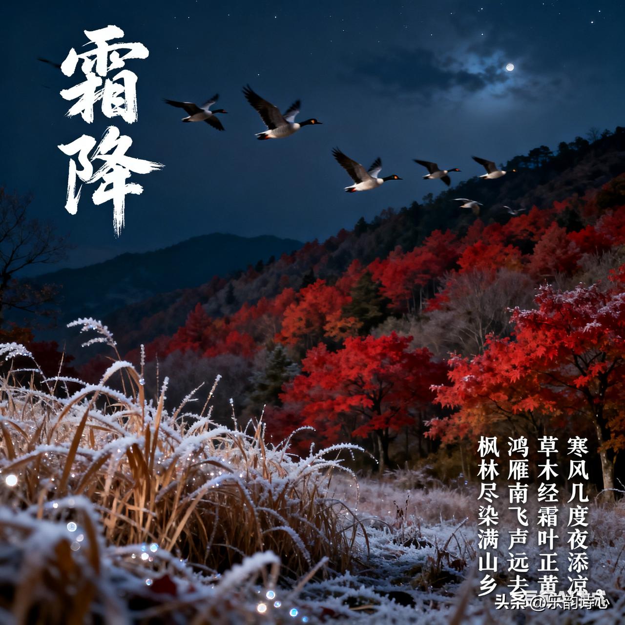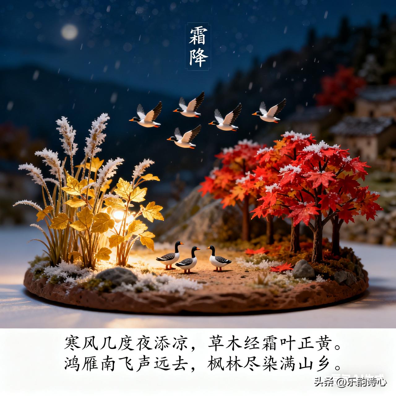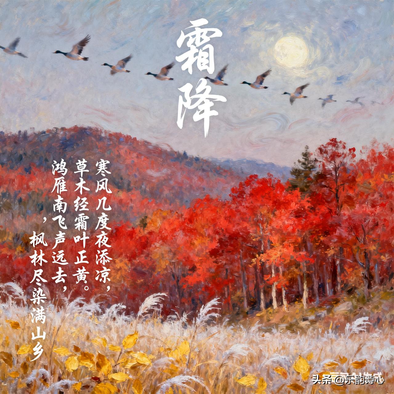 七律《霜降》乐韵诗心原创诗词: 首句“寒风几度夜添凉”,寒风吹过多个夜晚,凉意渐浓,细致描绘出气温随时间下降的过程,让人真切感受到秋夜的清冷,也暗示着季节的更迭。 “草木经霜叶正黄”,霜是秋寒的标志,草木受霜侵袭,叶子恰到好处地变黄,既有秋景的绚烂,又透露出生命的衰败,仿佛在诉说着时光的无情。 “鸿雁南飞声远去”,大雁遵循季节规律南飞,它们的叫声渐渐消失在远方。这一景象不仅增添了秋的空旷寂寥,还勾起人们的离别愁绪与对时光流逝的感慨,就像游子离家,一去不知归期。 末句“枫林尽染满山乡”,枫叶经霜变红,将整个山乡染成一片火红。与前几句的凄凉不同,此句展现出秋天热烈绚烂的一面,体现了大自然的生机与活力,让人在感受秋之悲凉的同时,也看到生命的顽强与美好。 整首诗通过对不同秋景的描写,从凉意、黄叶、雁声到红枫,展现了秋天丰富的层次和复杂的情感。
