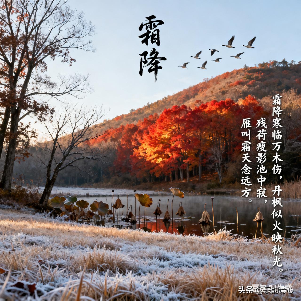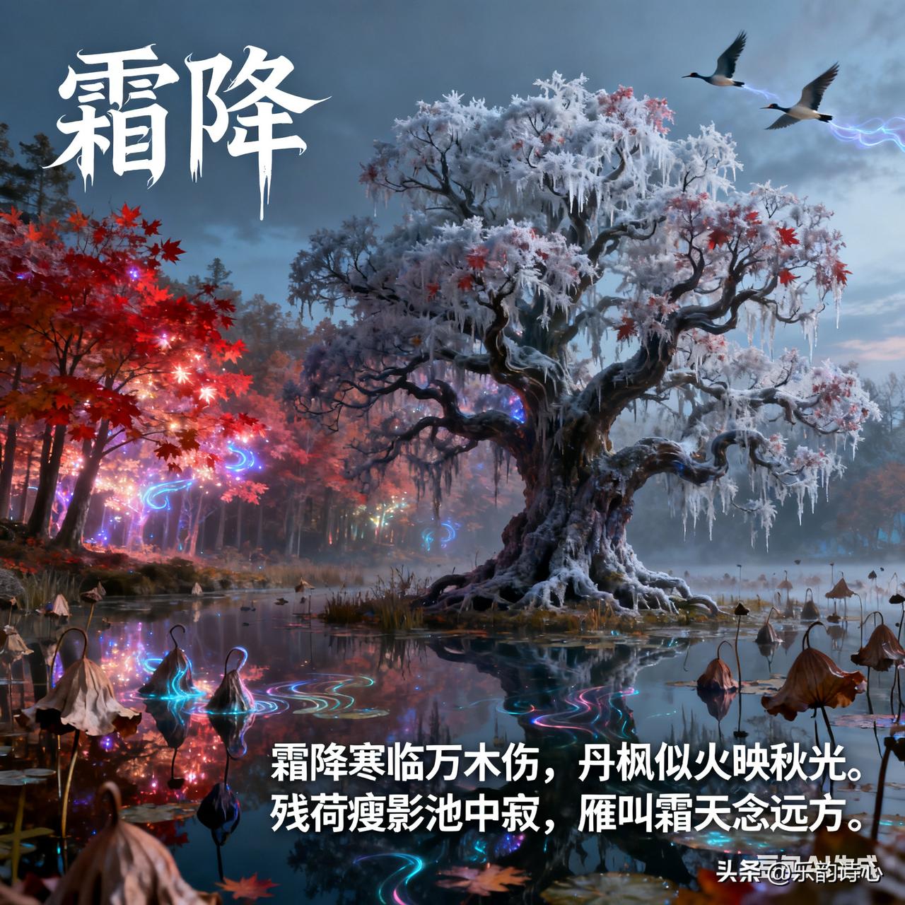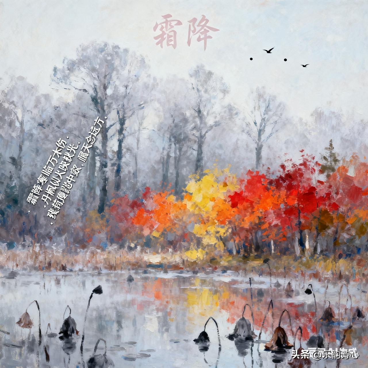 七律《霜降》乐韵诗心原创诗词: 霜降寒临万木伤,丹枫似火映秋光。 残荷瘦影池中寂,雁叫霜天念远方。 这首诗的首句点明霜降时节,寒冷降临使得树木仿佛都带着伤意,渲染出秋末的萧索氛围。次句描绘出霜降时枫叶红似火,与秋光相互映衬,为画面增添了一抹亮色。第三句聚焦池中残荷,其瘦影尽显孤寂,进一步强化了秋的寂寥之感。尾句写大雁在霜天鸣叫,引发诗人对远方的思念,升华了诗歌的情感,使整首诗既有对自然景象的描绘,又饱含着情感的抒发。