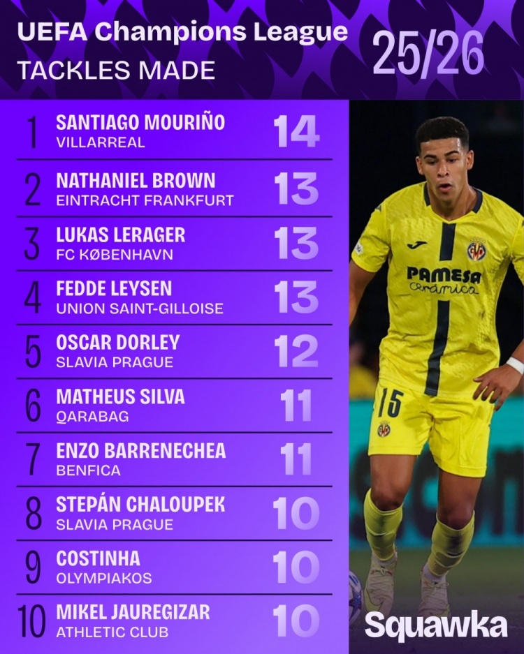 直播吧10月23日讯本赛季欧冠联赛阶段已战罢3轮,Squawka统计了到目前为止的铲球榜单,比利亚雷亚尔后卫圣地亚哥-穆里尼奥14次第一,法兰克福后卫布朗等三人13次分列二至四位。