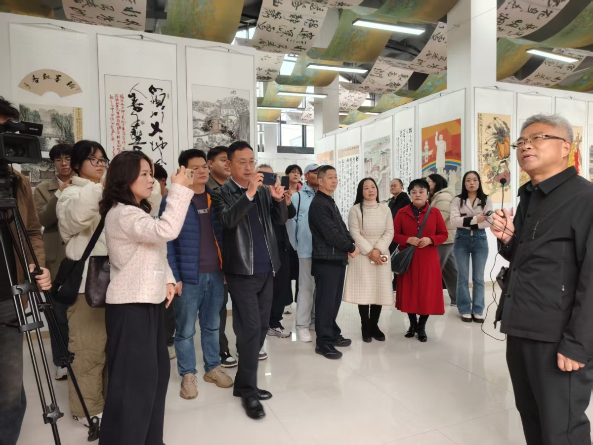 展厅内翰墨飘香、文化溢韵,一幅幅记录时代脉动、展现人民风貌的作品引人驻足。媒体记者们或用镜头捕捉展览亮点,或徜徉于诗篇文赋间细品佳作,或与创作者交流心得、探讨作品内涵,深刻感受艺术与本土文化交融的独特魅力。