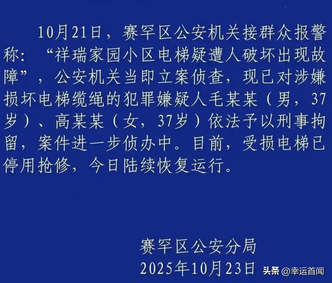 小区23部电梯的承重钢绳被人恶意切割,这不就是把所有人的生命当儿戏吗? 呼和浩特一小区发生触目惊心恶性事件!检修人员发现,50部电梯中竟有23部的承重钢绳遭人为切割!这是赤裸裸的谋杀行为,简直丧心病狂! 能精准破坏钢绳,凶手必是熟知电梯构造的内行。其心何其歹毒,视全楼居民性命为草芥!无论出于与物业纠纷还是行业恶性竞争,此等蓄意危害公共安全之举,天理难容。 万幸发现及时,未酿成惨剧。两名嫌疑人现已抓获,必须严惩不贷!不杀一儆百,何以告慰民心,何以震慑后来者?期待法律予以最严厉的审判!