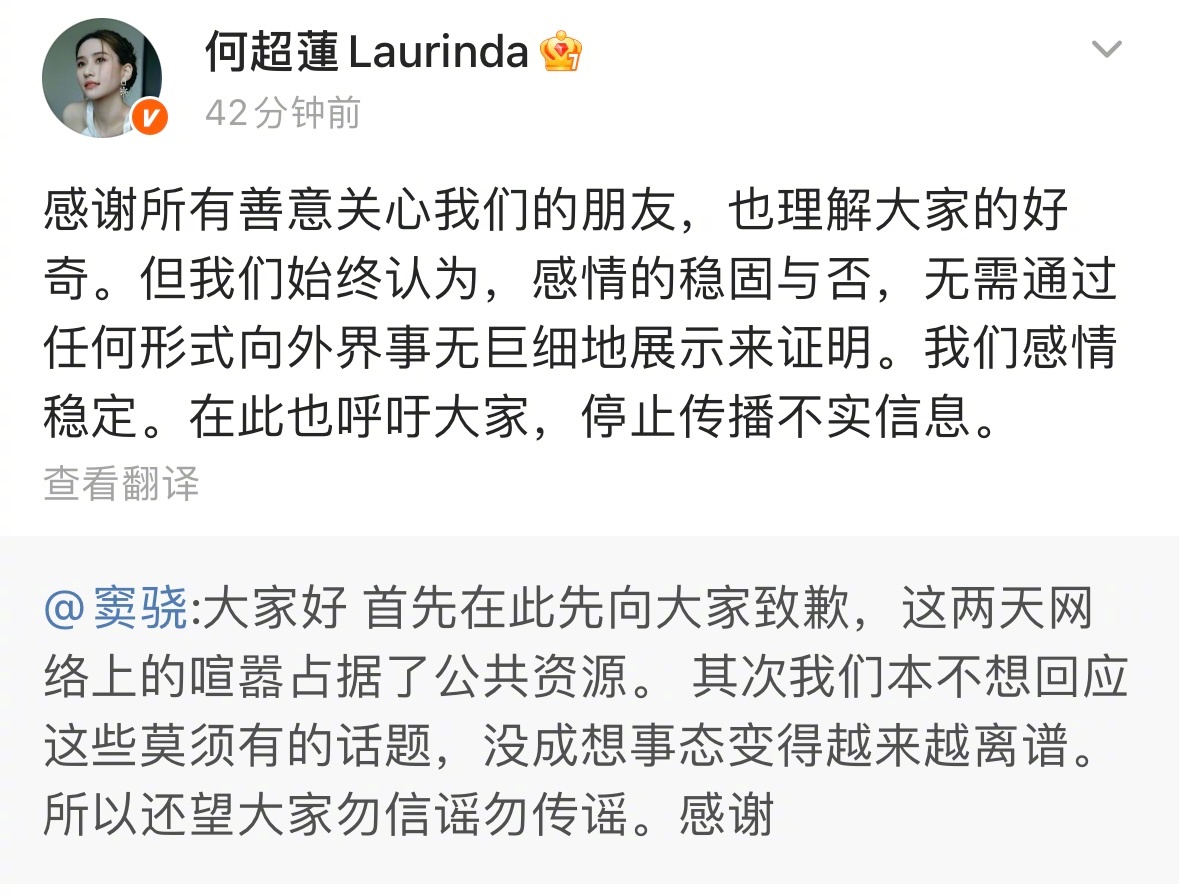 窦骁通过微博回应与何超莲离婚等传闻,称希望大家能够不传谣不信谣,同时何超莲也转发窦骁微博表示他们的感情很稳定,不需要用其他形式来自证!这波回应也是告诉大家两人的婚姻关系很好,希望他们能幸福下去,大家也不要再胡乱揣测没有的事啦[握手]窦骁请大家勿信谣勿传谣