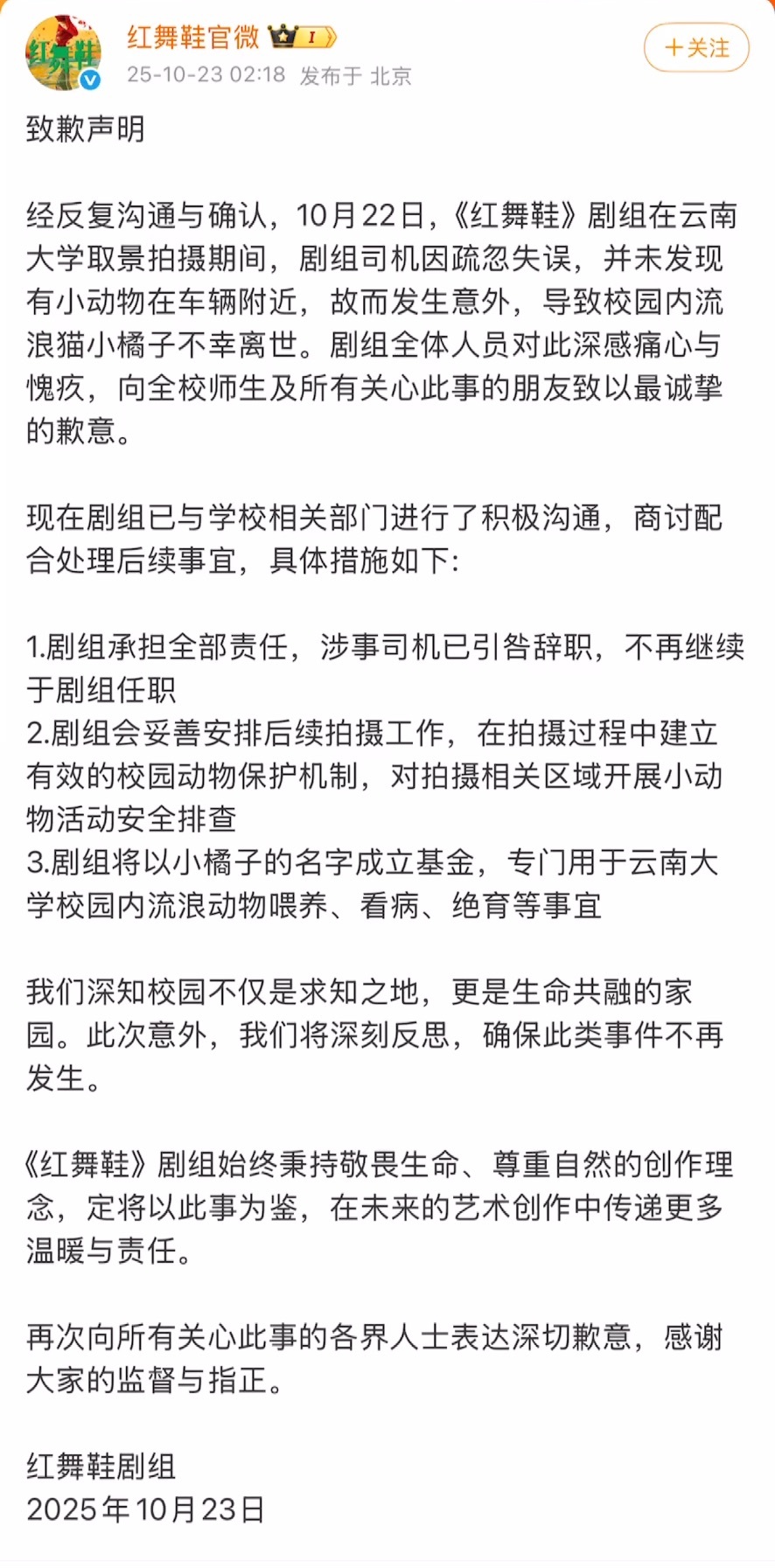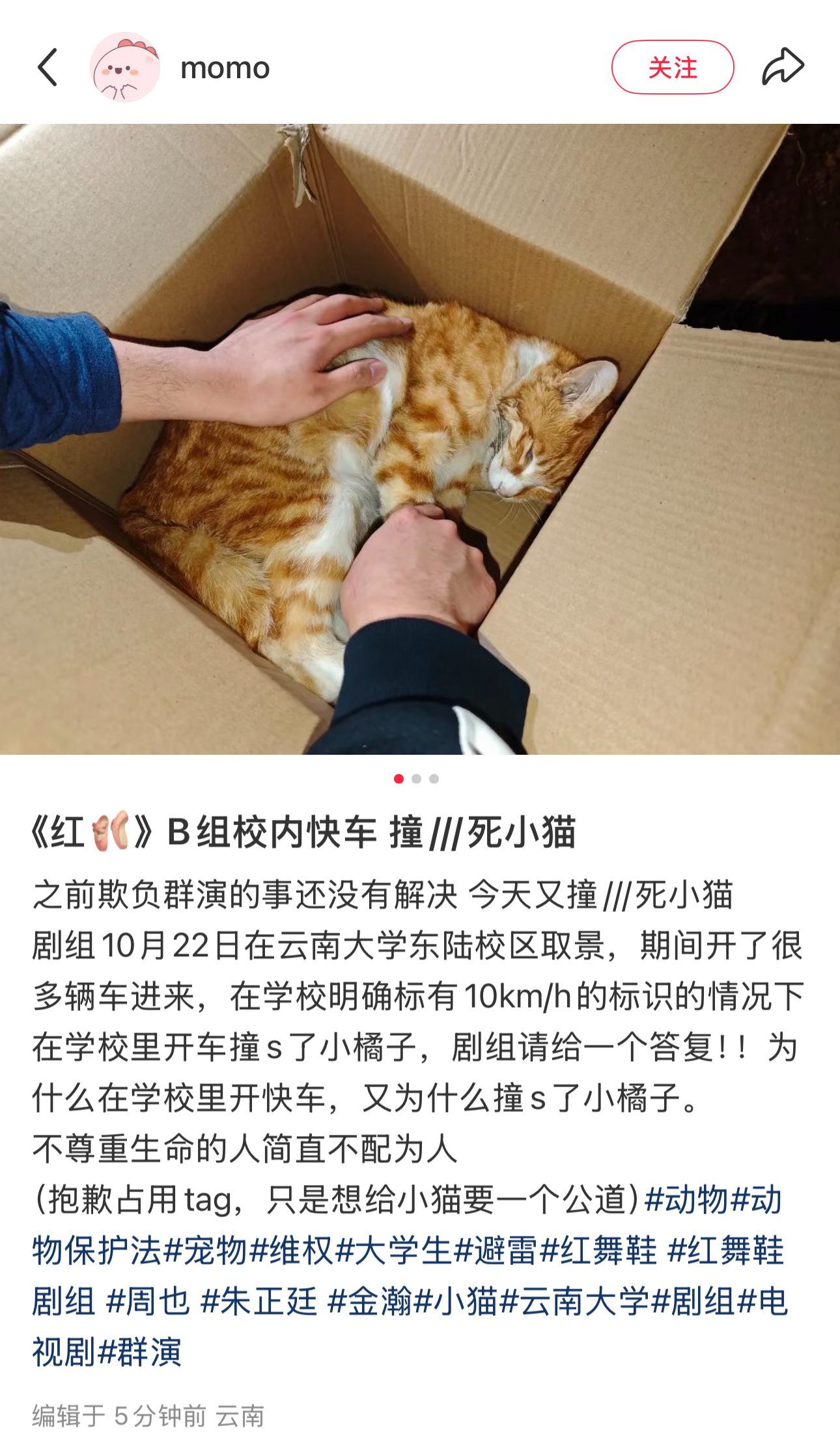 曝红舞鞋剧组开快车撞死猫10月22日,《红舞鞋》剧组在云南大学东陆校区取景时,剧组司机超速行驶撞死了校内学生合力照顾的流浪猫“小橘子”。学生在网上为“小橘子”发声,剧组最后公开发文道歉。虽然剧组道歉了,但小猫逝去的生命也回不来了![伤心]