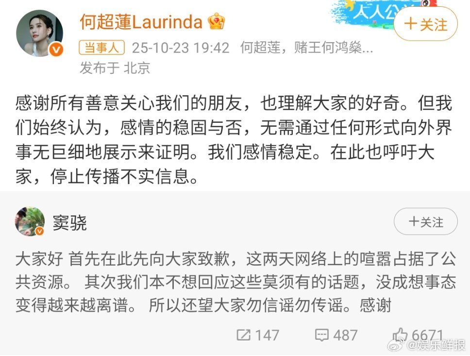 窦骁何超莲发博回应争议,称感情稳定,不想回应莫须有的话题,但传闻越来越离谱,因此出面回应,并呼吁停止传播不实信息