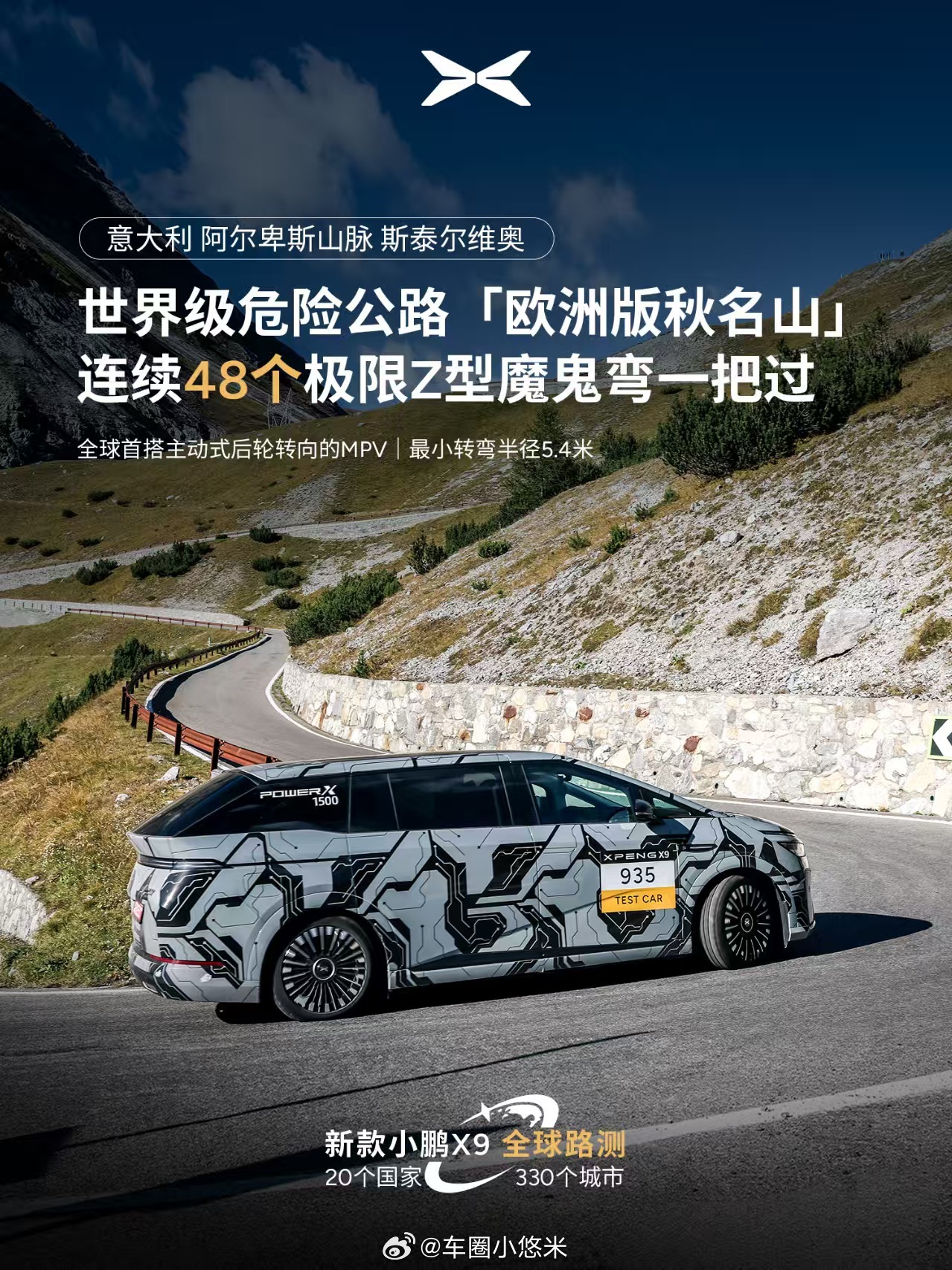 新款小鹏X9「全球道路测试」持续进行中,继何小鹏亲自带队新款小鹏X9在德国老城区狭窄小路灵活穿行、在不限速高速路上顶着大风大雨开到120km/h依然非常平稳、安静,本次挑战意大利阿尔卑斯山脉斯泰尔维奥连续极限盘山弯道,新款小鹏X9丝滑通过连续48个极限Z型魔鬼弯,高海拔连续爬坡表现稳定,打造值得全球家庭信赖的「家用大七座」。