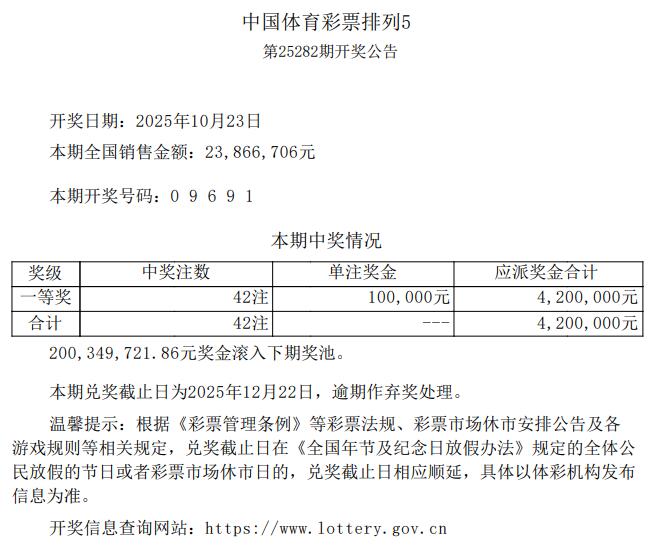 10月23日体彩中奖号码 排列5开出42注一等奖