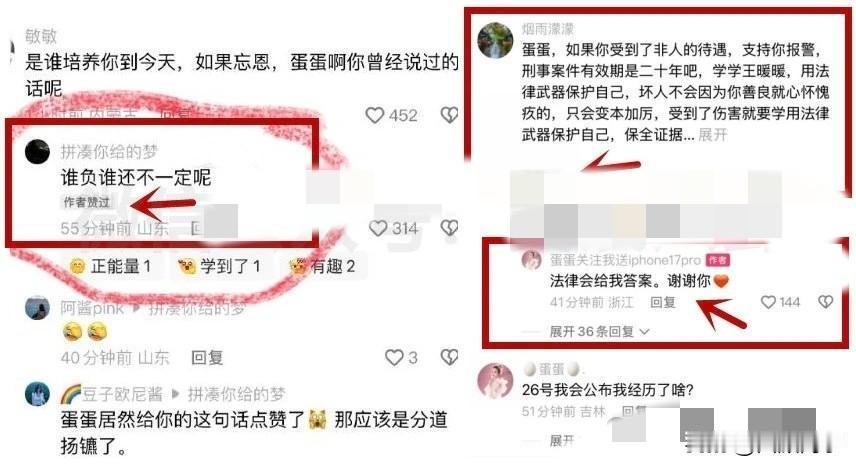 细思极恐!蛋蛋坐轮椅默认被关“小Hei屋”受非人待遇,答复:法律会给我答案。 截止今晚23:30分,蛋蛋的小号发布3个作品已涨粉327万+!在最新的一段预热视频中,将自己坐在轮椅的画面公开,看背景当时身在国外某医院。 蛋蛋也表示将在26号当天公开这6年(意思“辛选”期间),以及消失4个月的内情公之于众! 当粉丝评论“不会是关小Hei屋了吧?”,蛋蛋对此点赞表示默认! 还有粉丝评论建议蛋蛋若是遭受非人待遇就去报警,用法律维权,刑事案件有效期是20年! 蛋蛋答复:法律会给我答案,谢谢你!“辛选”粉丝提醒蛋蛋别忘恩,有人回复“谁负谁还不一定呢”,蛋蛋也该条评论点了赞!